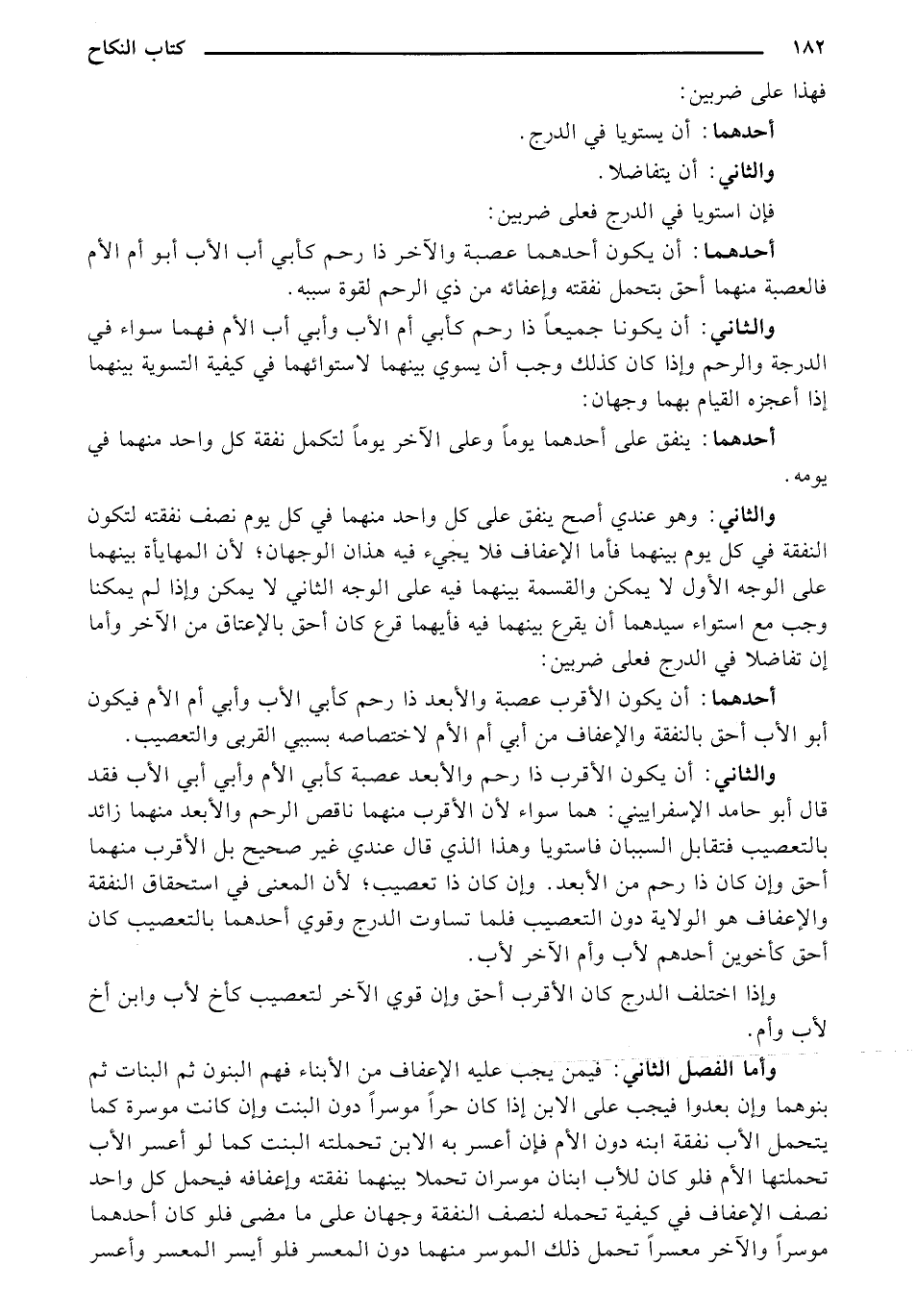 والثاني: أن يكون الأقرب ذا وحم والأبعد عصبة كأبي الأم وأبي أبي الأب فقد قال أبو حامد الإسفراييني: هما سواء لأن الأقرب منهما ناقص الرحم والأبعل منهما زائد بالتعصيب فتقابل السببان فاستويا وهذا الذي قال عندي غير صحيح بل الأقرب منهما أحق وان كان ذا وحم من الأبعد. وان كان ذا تعصيب, لأن المعنى في استحقاق النفقة والإعفاف هو الولاية دون التعصيب فلما تساوت الدرج وقوي أحدهما بالتعصيب كان أحق كأخوين أحدهم لأب وأم الآخر لأب.