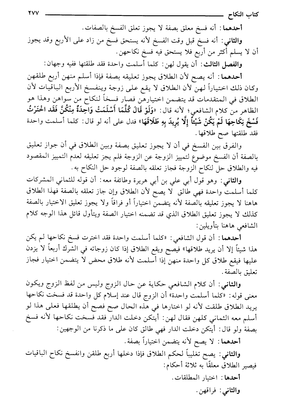 والثاني: وهو قول أبي علي بن أبي هريرة وطائفة معه: أن قوله للمثاني المشركات كلما أسلمت واحدة فهي طالق لا يصح لأن الطلاق وإن جاز تعلقه بالصفة فهذا الطلاق هاهنا لا يجوز تعليقه بالصفة لأنه يتضمن اختيارًا أو فراقًا ولا يجوز تعليق الاختيار بالصفة كذلك لا يجوز تعليق الطلاق الذي قد تضمنه اختيار الصفة ويتأول قائل هذا الوجه كلام الشافعي هاهنا بتأويلين: