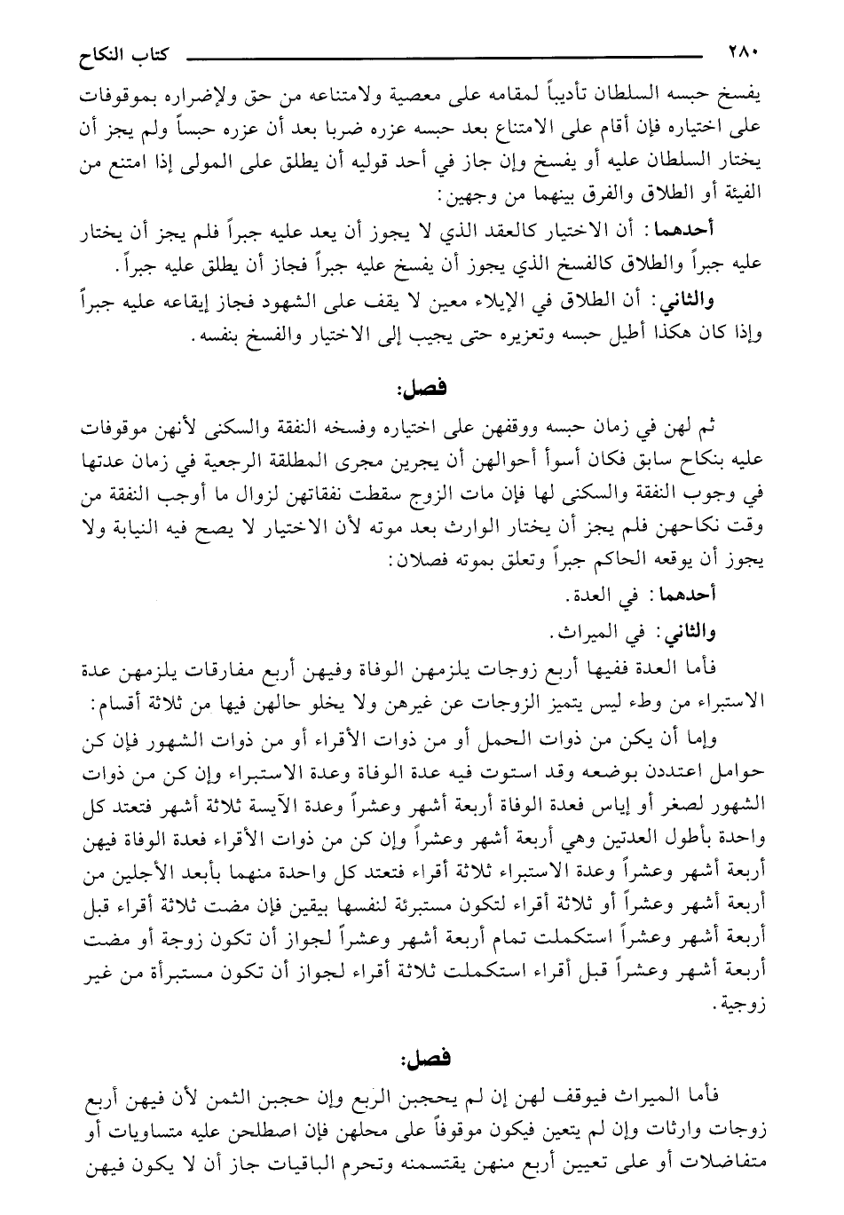 ثم لهن في زمان حبسه ووقفهن على اختياره وفسخه النفقة والسكنى لأنهن موقوفات عليه بنكاح سابق فكان أسوأ أحوالهن أن يجرين مجرى المطلقة الرجعية في زمان عدتها في وجوب النفقة والسكنى لها فإن مات الزوج سقطت نفقاتهن لزوال ما أوجب النفقة من وقت نكاحهن فلم يجز أن يختار الوارث بعد موته لأن الاختيار لا يصح فيه النيابة ولا يجوز أن يوقعه الحاكم جبرًا وتعلق بموته فصلان: