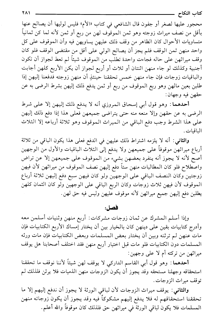 والثاني: يوقف ميراث الزوجات لأن لباقي الورثة لا يجوز أن ندفع إليهم إلا ما تحققنا استحقاقهم له فلا يدفع إليهم مشكوكًا فيه وقد يجوز أن يكون زوجاته منهن المسلمات فلا يكون لباقي الورثة في ميراثهن حق فلذلك كان موقوفًا والله أعلم.
