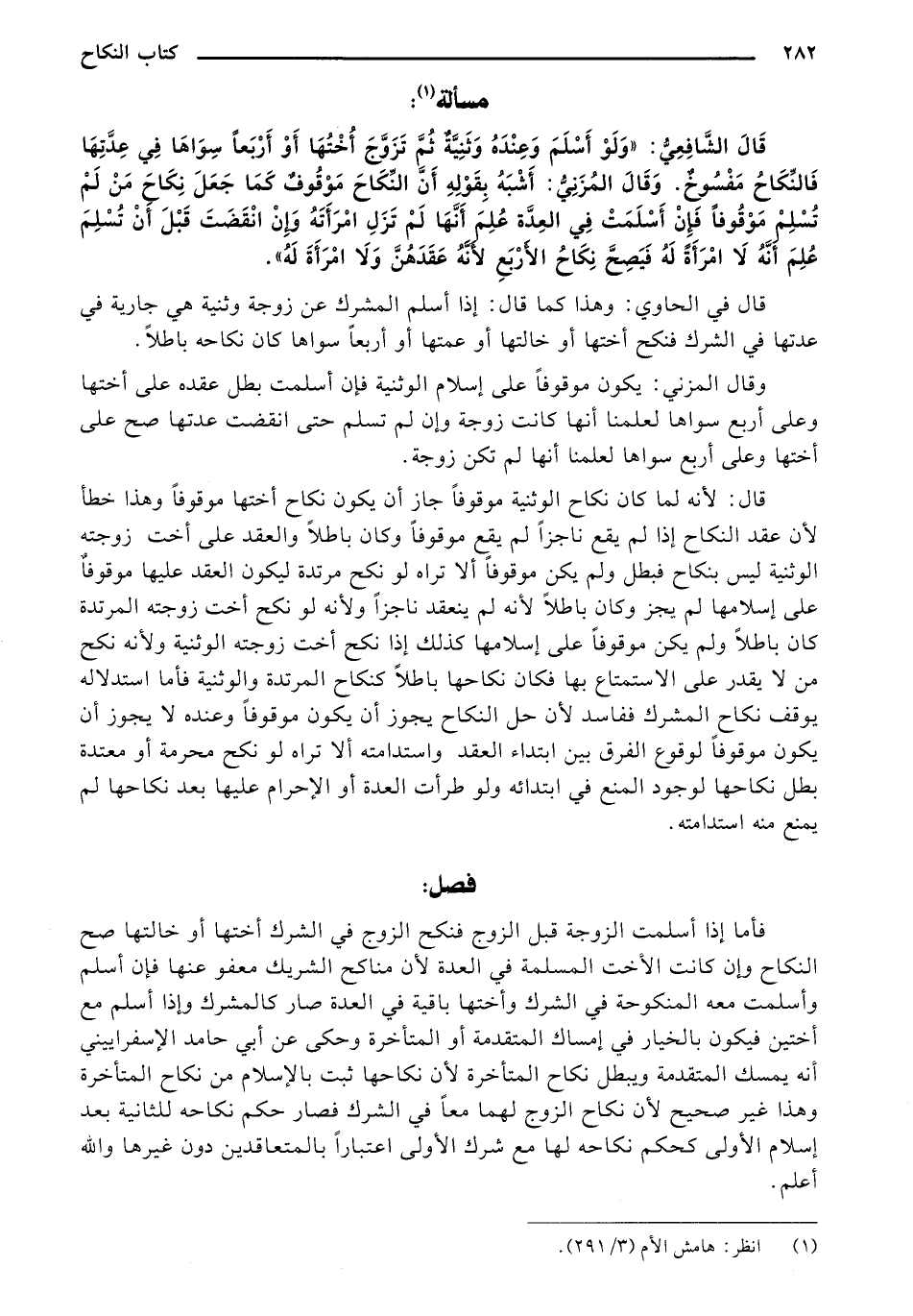 قَالَ الشَّافِعِيُّ: "وَلَوْ أَسْلَمَ وَعِنْدَهُ وَثَنِيَّةٌ ثُمَّ تَزَوَّجَ أُخْتَهَا أَوْ أَرْبَعًا سِوَاهَا فِي عِدَّتِهَا فَالنِّكَاحُ مَفْسُوخٌ. وقَالَ الْمُزَنِيّ: أَشْبَهَ بِقَوْلِهِ أنَّ النِّكَاحَ مَوْقُوفٌ كَمَا جَعَلَ نِكَاحَ مَنْ لَمْ تُسْلِمْ مَوْقُوفًا فَإِنْ أَسْلَمَتْ فِي الْعِدَّةِ عَلِمَ أَنَّهَا لَمْ تَزَلْ امْرَأَتَهُ وَإنْ انْقَضَتَ قَبْلَ أَنْ تُسْلِمَ عُلِمَ أَنَّهُ لَا امْرَأَةً لَهُ فَيَصِحَّ نِكَاحُ الأَرْبَعِ لأنَّهُ عَقَدَهُنَّ وَلَا امْرأَةَ لَهُ".