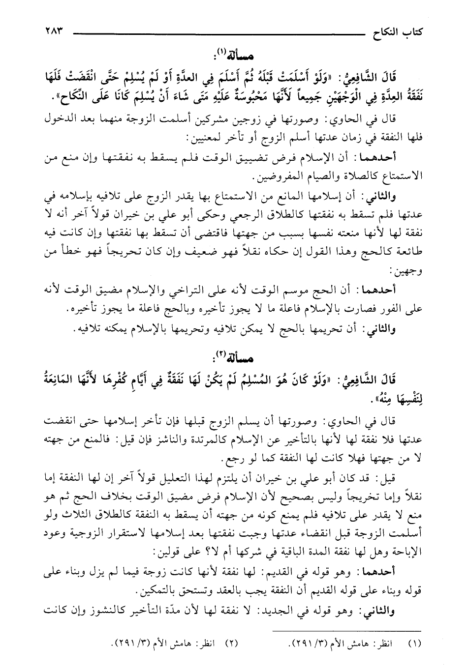 قال في الحاوي: وصورتها في زوجين مشركين أسلمت الزوجة منهما بعد الدخول فلها النفقة في زمان عدتها أسلم الزوج أو تأخر المعنيين: