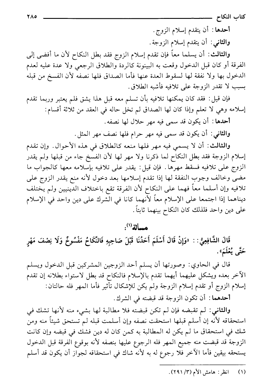 قَالَ الشَّافِعِيً: "وَإِنْ قالَ أَسْلَمَ أَحَدُنَا قَبْلَ صَاحِبِهِ فَالنِّكاحُ مَفْسُوخٌ وَلَا نِصْفَ مَهْرٍ حَتَّى يُعْلَمَ".
