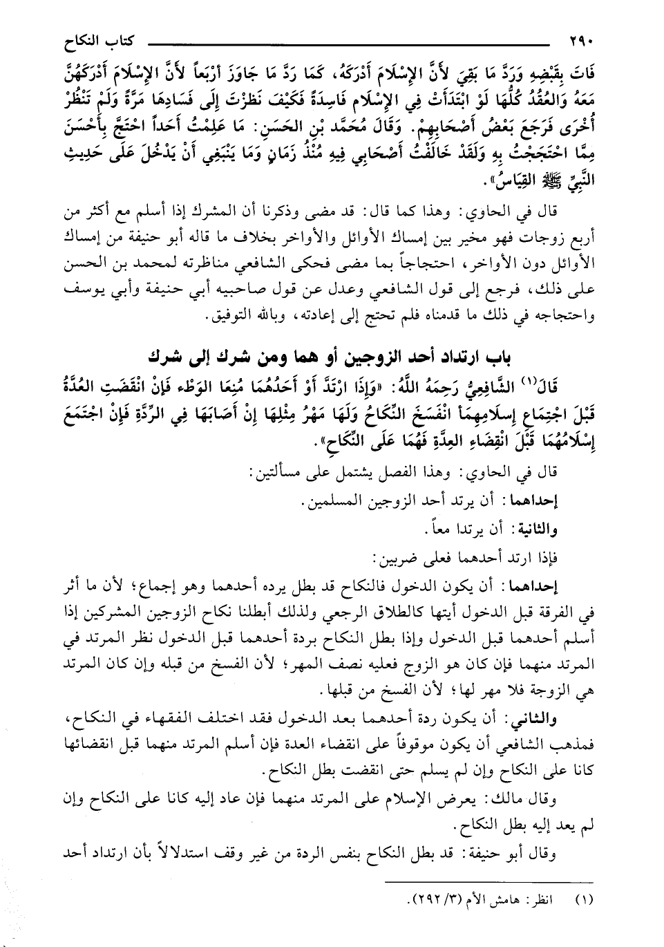 فَاتَ بِقَبْضِهِ وَرَدَّ مَا بَقِيَ لأَنَّ الإِسْلاَمَ أَدْرَكَهُ، كَمَا رَدَّ مَا جّاوَزَ أرْبَعًا لأَنَّ الإِسْلَامَ أَدْرَكَهُنَّ مَعَه وَالعُقُدٌ كُلُّهَا لَوء ابْتَدَأَتْ فِي الإِسلَام فَاسِدةً فَكَيْفَ نَظرْتَ إِلَى فَسَادِهَا مَرةً وَلَمْ تَنْظُرْ أُخْرَى فَرَجَعَ بَعْضُ أَصْحَابِهِمْ. وَقَالَ مُحَمَّد بْنِ الحَسَنِ: مَا علِمْتُ أَحَدًا احْتجَّ بِأحْسَنَ مِمَّا احْتجَجْتُ بِهِ وَلَقَدْ خَالَفْتُ أَصْحَابِي فِيهِ مُنْذُ زَمَانٍ وَمَا يَنْبَغِي أَن يَدخُلَ عَلَى حَدِيثِ النَّبِيِّ صلى الله عليه وسلم القِيَاسُ".