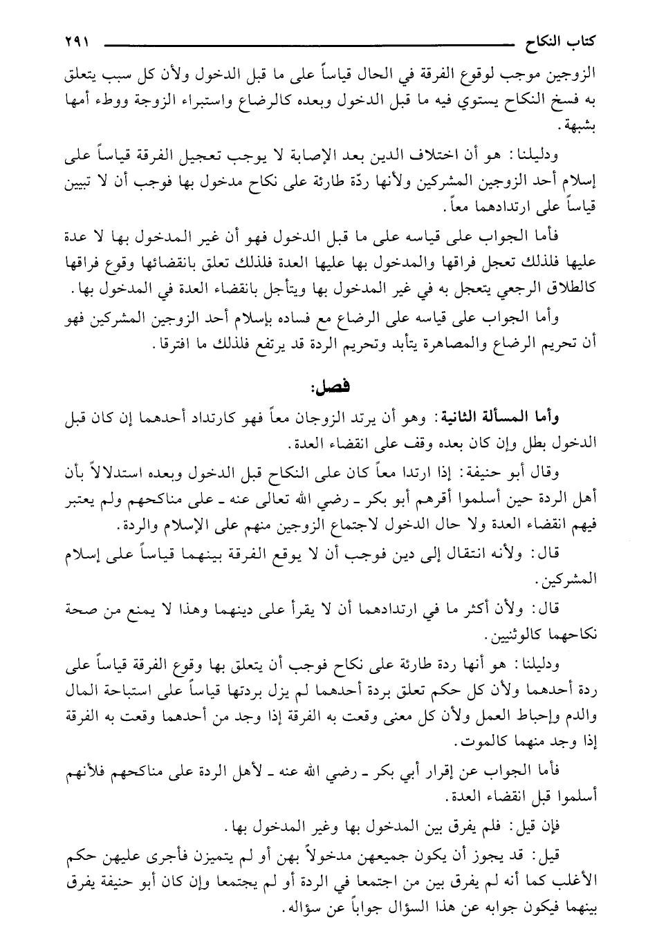 ودليلنا: هو أن اختلاف الدين بعد الإصابة لا يوجب تعجيل الفرقة قياسًا على إسلام أحد الزوجين المشركين ولأنها ردّة طارئة على نكاح مدخول بها فوجب أن لا تبيين قياسًا على ارتدادهما معًا.