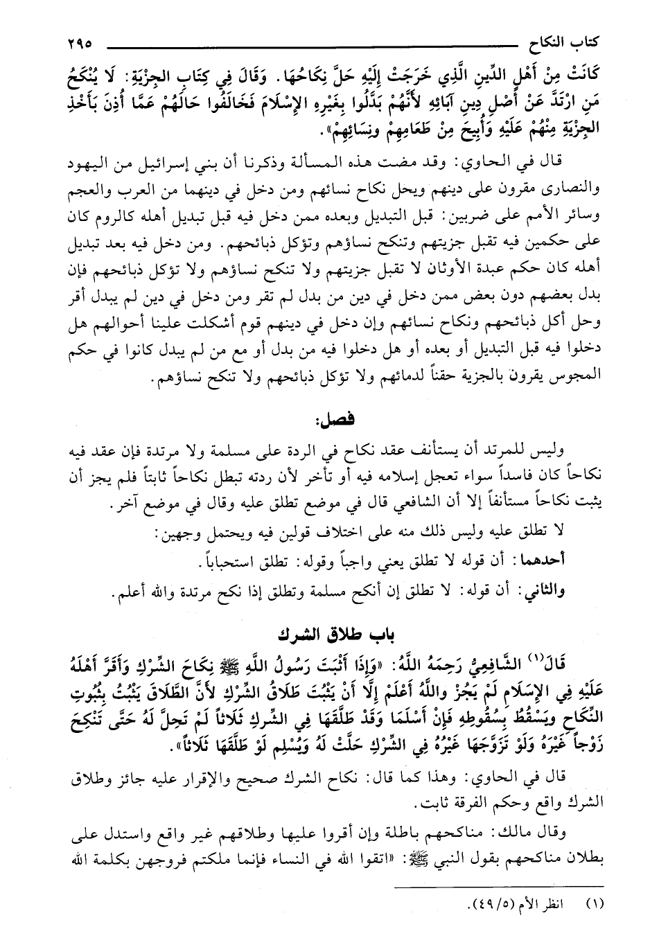قَالَ الشَّافِعِيُّ رَحِمَهُ اللهُ: "وَإِذَا أَثْبَتَ رَسُولُ اللهِ صَلَى الله عليه وسلم نِكَاحَ الشِّرْكِ وَأَقَرَّ أَهْلَهُ عَلَيْهِ فِي الإِسَلَامِ لَمْ يَجُزْ واللهُ أَعْلَمْ إِلَّا أَنْ يَثْبُتَ طَلَاقُ الشِّرْكِ لَأنَّ الطَّلاقَ يَثْبُتُ بِثُبُوتِ النِّكَاحِ ويَسْقُطُ بِسُقُوطِهِ فَإِنْ أَسْلَمَا وَقَدْ طَلَّقَهَا فِي الشِّركِ ثَلَاثًا لَمْ تَحِلَّ لَهُ حَتَّى تَنْكِحَ زَوْجًا غَيْرَهُ وَلَوْ تَزَوَّجَهَا غَيْرُهُ فِي الشِّرْكِ حَلَّتْ لَهُ وِيُسْلِم لَوْ طَلَّقَهَا ثَلَاثًا".