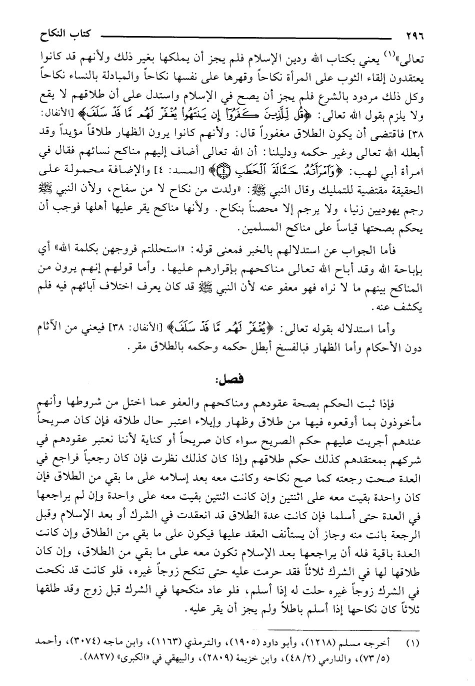 تعالى" يعني بكتاب الله ودين الإسلام فلم يجز أن يملكها بغير ذلك ولأنهم قد كانوا يعتقدون إلقاء الثوب على المرأة نكاحًا وقهرها على نفسها نكاحًا والمبادلة بالنساء نكاحًا وكل ذلك مردود بالشرع فلم يجز أن يصح في الإسلام واستدل على أن طلاقهم لا يقع ولا يلزم بقول الله تعالى: {قُل لِّلَّذِينَ كَفَرُوا إن يَنتَهُوا يُغْفَرْ لَهُم مَّا قَدْ سَلَفَ} [الأنفال: 38] فاقتضى أن يكون الطلاق مغفورًا قال: ولأنهم كانوا يرون الظهار طلاقًا مؤيدًا وقد أبطله الله تعالى وغير حكمه ودليلنا: أن الله تعالى أضاف إليهم مناكح نسائهم فقال في امرأة أبي لهب: {وامْرَأَتُهُ حَمَّالَةَ الحَطَبِ (4)} [المسد: 4] والإضافة محمولة على الحقيقة مقتضية للتمليك وقال النبي صلى الله عليه وسلم: "ولدت من نكاح لا من سفاح، ولأن النبي صلى الله عليه وسلم رجم يهوديين زنيا، ولا يرجم إلا محصنًا بنكاح. ولأنها مناكح يقر عليها أهلها فوجب أن يحكم بصحتها قياسًا على مناكح المسلمين.