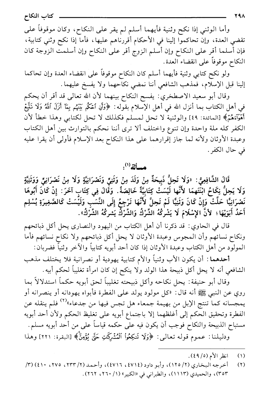 أحدهما: أن يكون الأب وثنيًا والأم كتابية يهودية أو نصرانية فلا يختلف مذهب الشافعي أنه لا يحل أكل ذبيحة هذا الولد ولا ينكح إن كان امرأة تغليبًا لحكم أبيه.