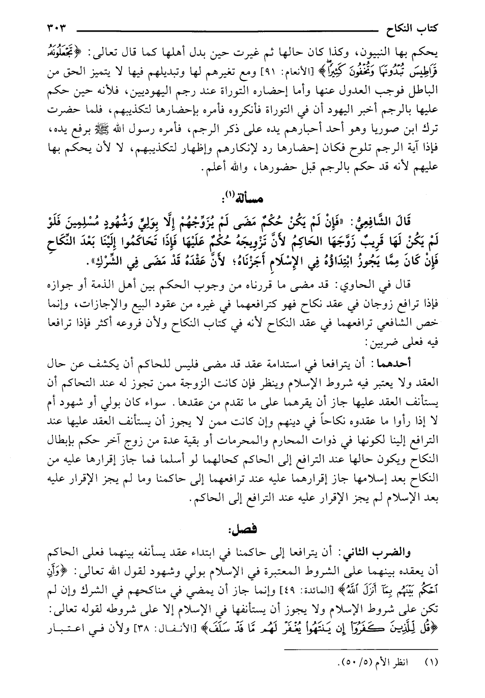 والضرب الثاني: أن يترافعا إلى حاكمنا في ابتداء عقد يسأنفه بينهما فعلى الحاكم أن يعقده بينهما على الشرو المعتبرة في الإسلام بولي وشهود لقول الله تعالى: {وَأَنِ احْكُمْ بَيْنَهُمْ بِمَا أَنْزَلَ اللَّهُ} [المائدة: 49] وإنما جاز أن يمضي في مناكحهم في الشرك وإن لم تكن على شروط الإسلام ولا يجوز أن يستأنفها في الإسلام إلا على شروطه لقوله تعالى: {قُلْ لِلَّذِينَ كَفَرُوا إِنْ يَنْتَهُوا يُغْفَرْ لَهُمْ مَا قَدْ سَلَفَ} [الأنفال: 38] ولأن في اعتبار