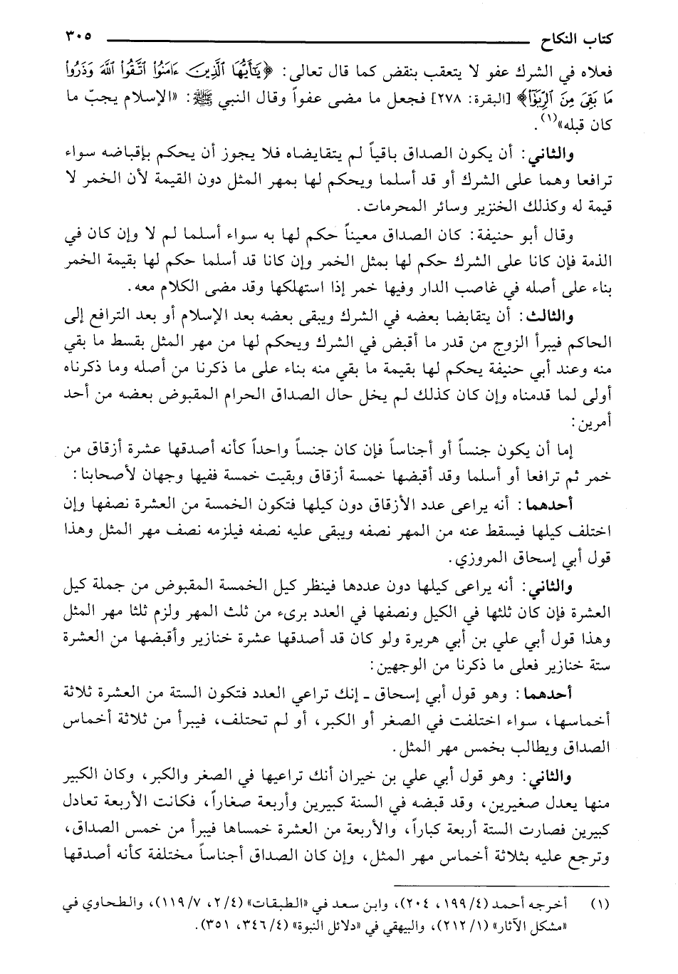 وقال أبو حنيفة: كان الصداق معينًا حكم لها به سواء أسلما لم لا وإن كان في الذمة فإن كانا على الشرك حكم لها بمثل الخمر وإن كانا قد أسلما حكم لها بقيمة الخمر بناء على أصله في غاصب الدار وفيها خمر إذا استهلكها وقد مضى الكلام معه.
