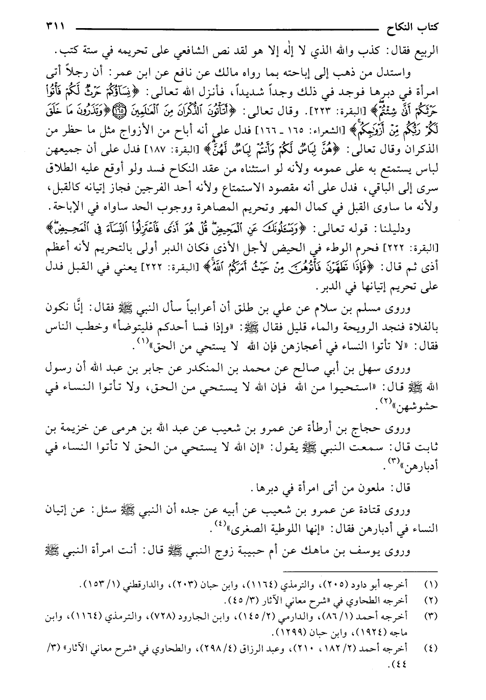 الربيع فقال: كذب والله الذي لا إله إلا هو لقد نص الشافعي على تحريمه في ستة كتب. واستدل من ذهب إلى إباحته بما رواه مالك عن نافع عن ابن عمر: أن رجلاً أتى امرأة في دبرها فوجد في ذلك وجدًا شديدًا، فأنزل الله تعالى: {نِسَاؤُكُمْ حَرْثٌ لَكُمْ فَاتُوا حَرْثَكُمْ أَنَّى شِئْتُمْ} [البقرة: 223]. وقال تعالى: {أَتَاتُونَ الذُّكْرَانَ مِنَ الْعَالَمِينَ (165) وَتَذَرُونَ مَا خَلَقَ لَكُمْ رَبُّكُمْ مِنْ أَزْوَاجِكُمْ} [الشعراء:165 - 166] فدل على أنه أباح من الأزواج مثل ما حظر من الذكران وقال تعالى: {هُنَّ لِبَاسٌ لَكُمْ وَأَنْتُمْ لِبَاسٌ لَهُنَّ} [البقرة: 187] فدل على أن جميعهن باس يستمتع به على عمومه ولأنه لو استثناه من عقد النكاح فسد ولو أوقع عليه الطلاق سرى إلى الباقي، فدل على أنه مقصود الاستمتاع ولأنه أحد الفرجين فجاز إتيانه كالقبل، ولأنه ما ساوى القبل في كمال المهر وتحريم المصاهرة ووجوب الحد ساواه في الإباحة.