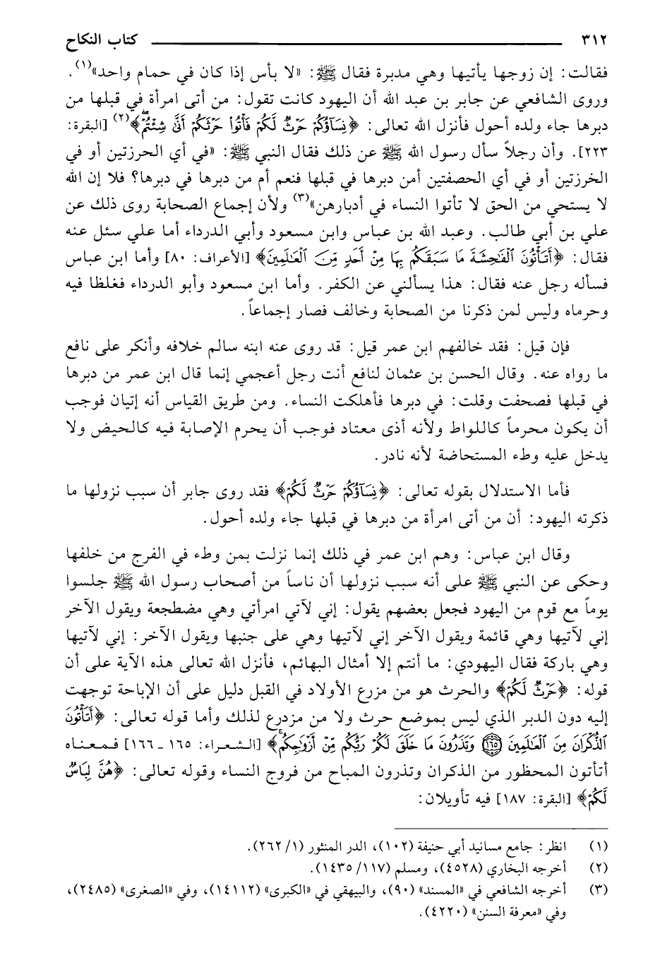 وروى الشافعي عن جابر بن عبد الله أن اليهود كانت تقول: من أتى امرأة في قبلها من دبرها جاء ولده أحول فأنزل الله تعالى: {نِسَاؤُكُمْ حَرْثٌ لَكُمْ فَاتُوا حَرْثَكُمْ أَنَّى شِئْتُمْ} [البقرة: 223]. وأن رجًلا سأل رسول الله صلى الله عليه وسلم عن ذلك فقال النبي صلى الله عليه وسلم: "في أي الحرزتين أو في الخرزتين أو في أي الحصفتين أمن دبرها في قبلها فنعم أم من دبرها في دبرها؟ فلا إن الله لا يستحي من الحق لا تأتوا النساء في أدبارهن" ولأن إجماع الصحابة روى ذلك عن على بن أبي طالب. وعبدالله بن عباس وابن مسعود وأبي الدرداء أما علي سئل عنه فقال: {أَتَاتُونَ الْفَاحِشَةَ مَا سَبَقَكُمْ بِهَا مِنْ أَحَدٍ مِنَ الْعَالَمِينَ} [الأعراف: 80] وأما ابن عباس فسأله رجل عنه فقال: هذا يسألني عن الكفر. وأما ابن مسعود وأبو الدرداء فغلظا فيه وحرماه وليس لمن ذكرنا من الصحابة وخالف فصار إجماعًا.