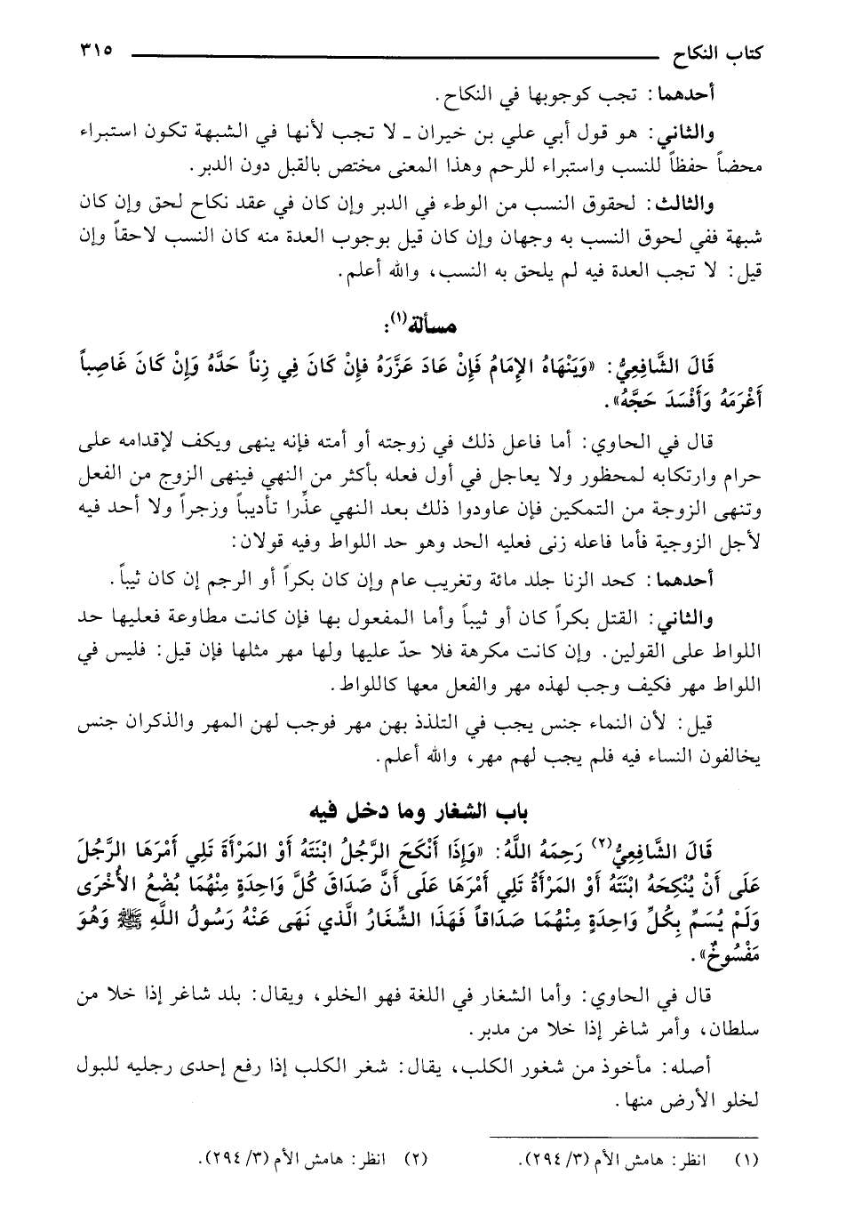 قَالَ الشَّافِعِيُّ رَحِمَهُ الله: "وإذا أنكح الرجل ابنته أو المرأة تلي أمرها الرجل على أن ينكحه ابنته أو المرأة تلي أمرها على أن صداق كل واحدة منهما بضع الأخرى ولم يسم بكل واحدة منهما صداقًا فهذا الشغار الذي نهى عنه رسول الله صلى الله عليه وسلم وهو مفسوخ".