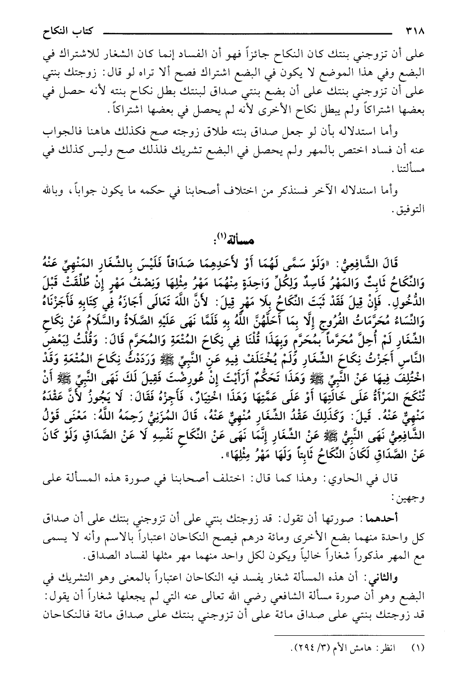 والثاني: أن هذه المسألة شغار يفسد فيه النكاحان اعتبارًا بالمعنى وهو التشريك في البضع وهو أن صورة الشافعي رضي الله تعالى عنه التي لم يجعلها شغارًا أن يقول: قد زوجتك بنتي على صداق مائة على أن تزوجني بنتك على صداق مائة فالنكاحان