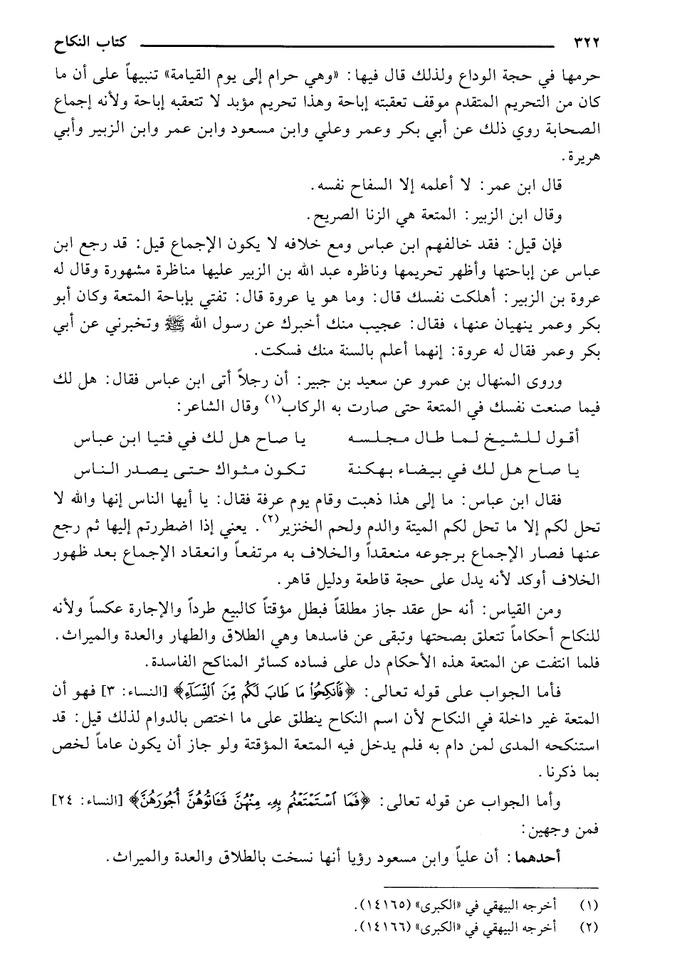 فإن قيل: فقد خالفهم ابن عباس ومع خلافه لا يكون الإجماع قيل: قد رجع ابن عباس عن إباحتها وأظهر تحريمها وناظره عبد الله بن الزبير عليها مناظرة مشهورة وقال له عروة بن الزبير: أهلكت نفسك قال: وما هو يا عروة قال: تفتي بإباحة المتعة وكان أبو بكر وعمر ينهيان عنها, فقال: عجيب منك أخبرك عن رسول الله صَلَّى اللَّهُ عَلَيْهِ وَسَلَّمَ وتخبرني عن أبي بكر وعمر فقال له عروة: إنهما أعلم بالسنة منك فسكت.