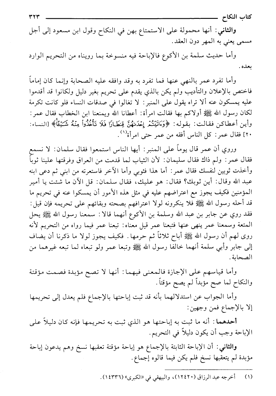 وروي أن عمر قال يومًا على المنبر: أيها الناس استمتعوا فقال سلمان: لا نسمع فقال عمر: ولم ذاك فقال سليمان: لأن الثياب لما قدمت من العراق وفرقتها علينا ثوبًا وأخذت ثوبين لنفسك فقال عمر: أما هذا فثوبي وأما الآخر فاستعرته من ابني ثم دعي ابنه عبد الله وقال: أين ثوبك؟ فقال: هو عليك, فقال سلمان: قل الآن ما شئت يا أمير المؤمنين فكيف يجوز مع اعتراضهم عليه في مثل هذه الأمور أن يمسكوا عنه في تحريم ما قد أحله رسول الله صَلَّى اللَّهُ عَلَيْهِ وَسَلَّمَ فلا ينكرونه لولا اعترافهم بصحته وبقائهم على تحريمه فإن قيل: فقد روي عن جابر بن عبد الله وسلمة بن الأكوع أنهما قالا: سمعنا رسول الله صَلَّى اللَّهُ عَلَيْهِ وَسَلَّمَ يحل المتعة وسمعنا عمر ينهى عنها فتبعنا عمر قيل معناه: تبعنا عمر فيما رواه من التحريم لأنه روى لهم أن رسول الله صَلَّى اللَّهُ عَلَيْهِ وَسَلَّمَ أباح ثلاثًا ثم حرمها. فكيف يجوز لولا ما ذكرنا أن يضاف إلى جابر وأبي سلمة أنهما خالفا رسول الله صَلَّى اللَّهُ عَلَيْهِ وَسَلَّمَ وتبعا عمر ولو تبعاه لما تبعه غيرهما من الصحابة.