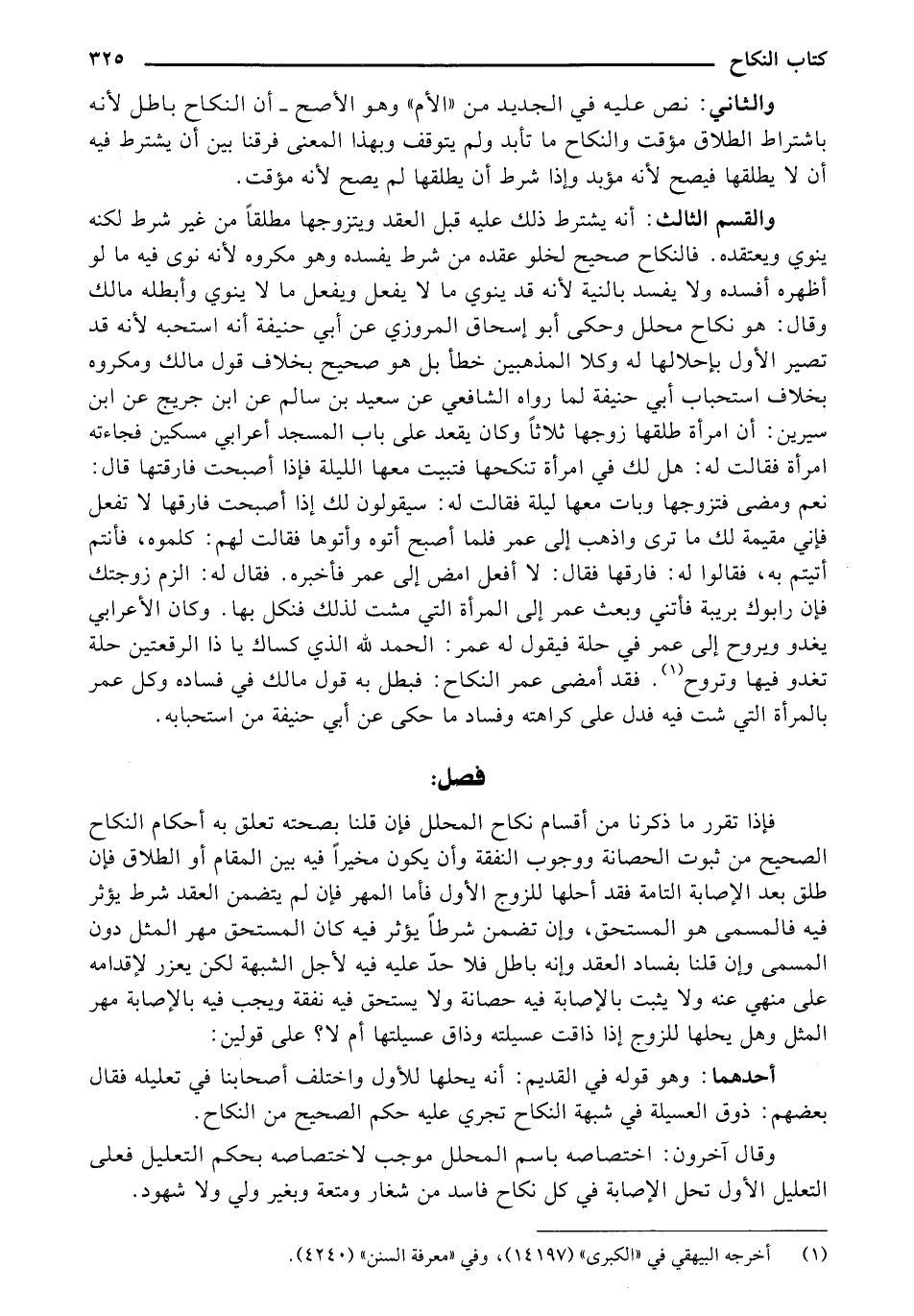والقسم الثالث: أنه يشترط ذلك عليه قبل العقد ويتزوجها مطلقًا من غير شرط لكنه ينوي ويعتقده. فالنكاح صحيح لخلو عقده من شرط يفسده وهو مكروه لأنه نوى فيه ما لو أظهره أفسده ولا يفسد بالنية لأنه قد ينوي ما لا يفعل ويفعل ما لا ينوي وأبطله مالك وقال: هو نكاح محلل وحكى أبو إسحاق المروزي عن أبي حنيفه أنه استحبه لأنه قد تصير الأول بإحلالها له وكلا المذهبين خطأ بل هو صحيح بخلاف قول مالك ومكروه بخلاف استحباب أبي حنيفة لما رواه الشافعي عن سعيد بن سالم عن ابن جريج عن ابن سيرين: أن امرأة طلقها زوجها ثلاثًا وكان يقعد على باب المسجد أعرابي مسكين فجاءته امرأة فقالت له: هل لك في امرأة تنكحها فتبيت معها الليلة فإذا أصبحت فارقتها قال: نعم ومضى فتزوجها وبات معها ليلة فقالت له: سيقولون لك إذا أصبحت فارقها لا تفعل فإني مقيمة لك ما ترى واذهب إلى عمر فلما أصبح أتوه وأتوها فقالت لهم: كلموه, فأنتم أتيتم به, فقالوا له: فارقها فقال: لا أفعل امض إلى عمر فأخبره. فقال له: الزم زوجتك فإن رابوك بريبة فأتني وبعث عمر إلى المرأة التي مشت لذلك فنكل بها. وكان الأعرابي يغدو ويروح إلى عمر في حلة فيقول له عمر: الحمد لله الذي كساك يا ذا الرقعتين حلة تغدو فيها وتروح. فقد أمضى عمر النكاح: فبطل به قول مالك في فساده وكل عمر بالمرأة التي شت فيه فدل على كراهته وفساد ما حكي عن أبي حنيفة من استحبابه.