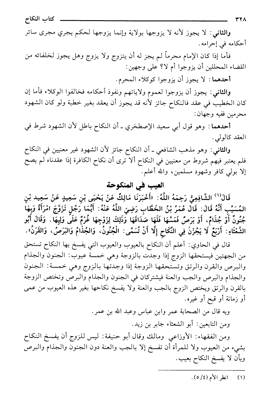 قَالَ الشَّافِعِيُّ رَحِمَهُ اللَّهُ: "أَخْبَرَنَا مَالِكٌ عَنْ يَحْيَى بْنِ سَعِيدٍ عَنْ سَعِيدٍ بْنِ الُمُسَيِّبِ أَنَّهُ قَالَ: قَالَ عُمَرُ بِنُ الخَطَّابِ رَضِيَ اللَّهُ عَنْهُ: أَيُّمَا رَجُلٍ تَزَوَّجَ امْرَأةً وَبِهَا جُنُونٌ أَوْ جُذَامُ, أَوْ بَرَصٌ فَمَسَّهَا فَلَهَا صَدَاقَهَا وَذَلِكَ لِزَوْجِهَا غُرْمٌ عَلَى وَلِيِهَا. وَقَالَ أَبُو الشَّعْثَاءِ: أَرْبَعٌ لَا يَجُزْنَ فِي النِّكَاحِ إلَّا أَنْ تُسَمَّى: الْجُنُونُ, وَالجُذَامُ وَالبَرَصُ, وَالقَرَنُ".