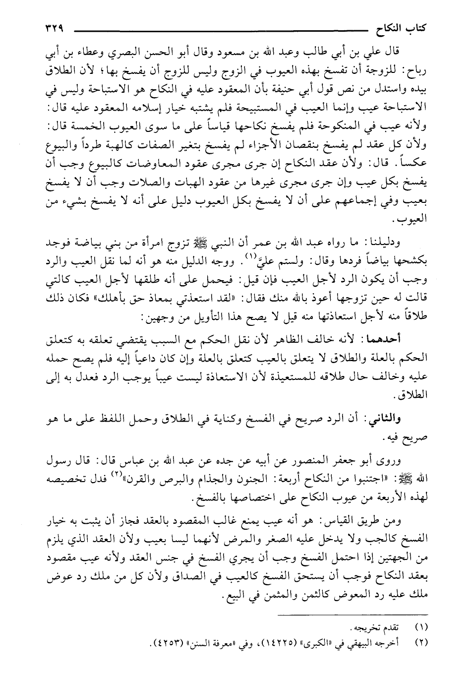 وروى أبو جعفر المنصور عن أبيه عن جده عن عبد الله بن عباس قال: قال رسول الله صَلَّى اللَّهُ عَلَيْهِ وَسَلَّمَ: "اجتنبوا من النكاح أربعة: الجنون والجذام والبرص والقرن" فدل تخصيصه لهذه الأربعة من عيوب النكاح على اختصاصها بالفسخ.