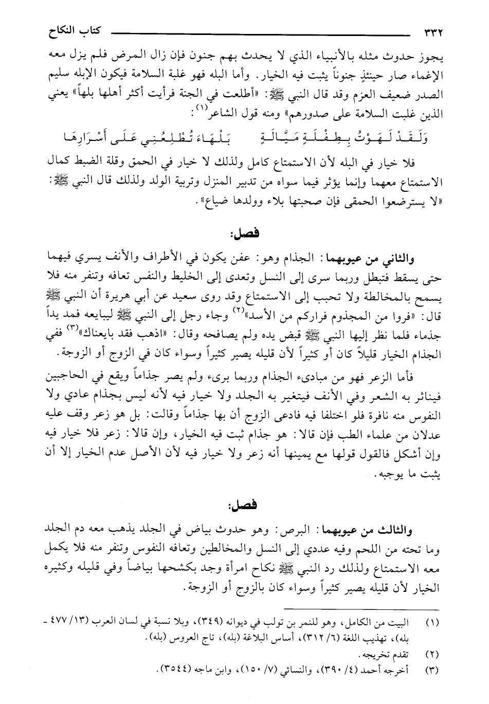 والثاني من عيوبهما: الجذام وهو: عفن يكون في الأطراف والأنف يسرى فيهما حتى يسقط فتبطل وربما سرى إلى النسل وتعدى إلى الخليط والنفس تعافه وتنفر منه فلا يسمح بالمخالطة ولا تحبب إلى الاستمتاع وقد روى سعيد عن أبى هريرة أن النبي صلى الله عليه وسلم