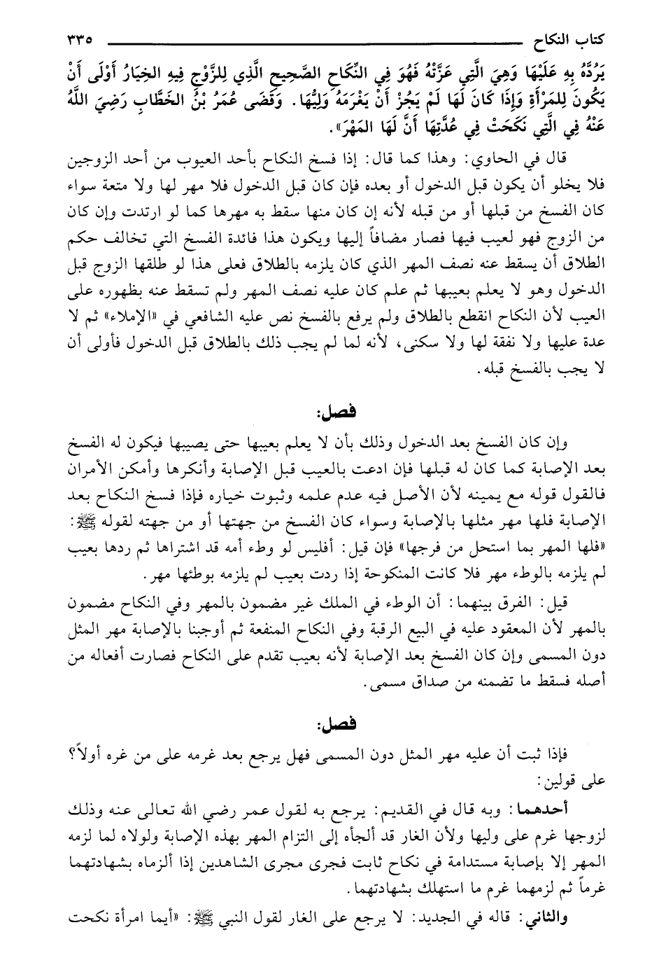 يَرُدّهُ بِهِ عَلَيْهَا وَهي التي عَزَّتْهُ فَهُوَ في النِّكَاح الصّحِيح الذي لِلزَّوْج فِيهِ الخِيَارُ أَولي أَنْ يَكُونَ لِلمَرْأَةِ وَإِذَا كَانَ لَهَا لَمْ يَجُزْ أَنْ يَغْرَمَهُ وليُّهَا، وَقَضَى عُمَرُ بْنُ الخَطَّابِ رضي اللهُ عَنْهُ في التي نَكَحَتْ في عُدَّتِهَا أَنَّ لَهَا الَمهْرَ".