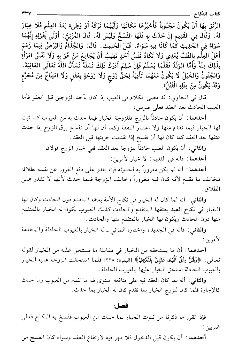 الرَّتْقُ بِهَا أَنْ يَكُونُ مجبوبًا فَأَخِيرُهَا مَكَانِهَا وَأَيُّهُمَا تَرْكَهُ أَوْ وُطِئَ بَعْدَ الْعِلْمِ فَلَا خِيَارٌ لَهُ. وَقَالَ في الْقَدِيمَ إِنَّ حَدَثً بِهِ فَلَهَا الْفَسْخُ وَلَيْسَ لَهُ. قَالَ المزني: أَولي بُقولُهُ إِنَّهُمَا سَواءً في الْحَديثَ كَمَا كَانَا فِيه سَواءٌ، قَبُّ الْحَديثِ. قَالٌ: وَالْجُذَامُ وَالْبرصُ فِيمَا زَعَمَ أهْلُ الْعِلْمِ بِالطِّبِّ يُعْدَي وَلَا تَكَادُ نَفْسُ أَحَدُّ تُطَيِّبُ أن يُجَامِعَ مِنْ هُوَ بِهِ وَلَا نَفْسُ اِمْرَأَةٌ بِذَلِكً مِنْه وَأَمَّا الْوَلَدُ فَقَلَّمَا يُسَلِّمُ فَإِنَّ سُلَّمَ أُدْرِكُ ذَلِكً نَسْلُهُ نَسْأَلُ اللهَ تَعَالَى الْعَافِيَةَ. وَالْجُنُونُ وَالْخَبَلَ لَا يُكَوِّنْ مَعَهُمَا تأدية لَحِقَ زَوْجٌ وَلَا زَوْجَةٌ بِعَقْلٍ وَلَا اِمْتِناعٌ مِنْ مُحَرَّمٍ وَقَدْ يَكُونُ مِنْ مِثْلُه الْقَتْلَ".
