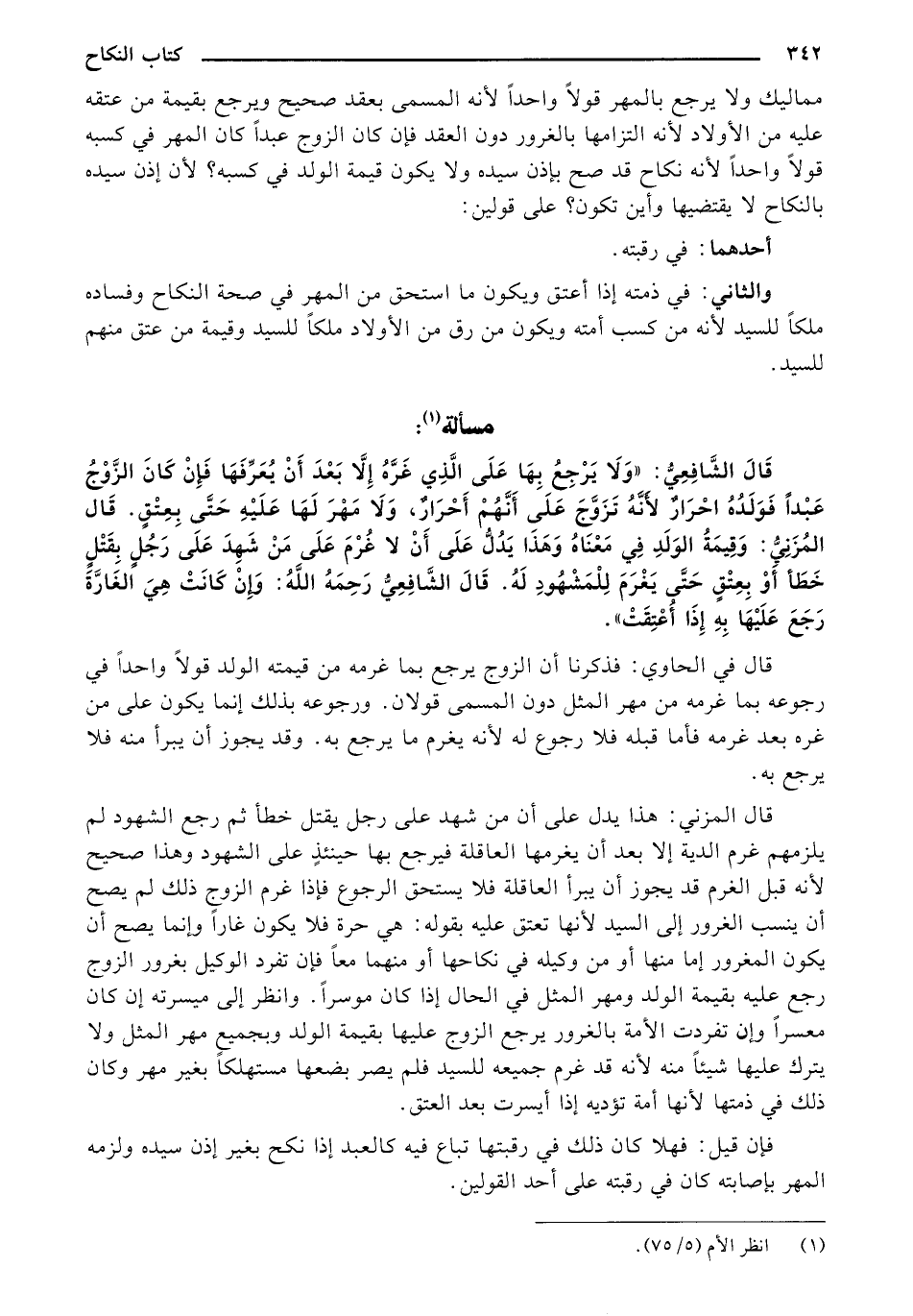 قَالَ الشَّافِعِيُّ: "وَلَا يَرْجِع بِهَا عَلَى الَّذِي غَرَّهُ إِلَّا بَعْدَ أَنْ يُعَرِّفَهَا فَإِنْ كَانَ الزَّوْجُ عَبْداً فَوَلَدُهُ احْرَارٌ لأَنَّهُ تَزَوَّجَ عَلَى أَنَّهُمْ أَحْرَارٌ، وَلَا مَهْرَ لَهَا عَلَيْهِ حَتَّى بِعِتْقٍ. قَال المُزَنِيُّ: وَقِيمَةُ الوَلَدِ فِي مَعْنَاهُ وَهَذَا يَدُلُّ عَلَى أَنْ لا غُرْمَ عَلَى مَنْ شَهِدَ عَلَى رَجُلٍ بِقَتْلٍ خَطَأ أَوْ بِعِتْقٍ حَتَّى يَغْرَمَ لِلْمَشْهُودِ لَهُ. قَالَ الشَّافِعِيُّ رَحِمَهُ اللهُ: وَإِنْ كَانَتْ هِيَ الغَارَّةَ رَجَعَ عَلَيْهَا بِهِ إِذَا أُعْتِقَتْ".