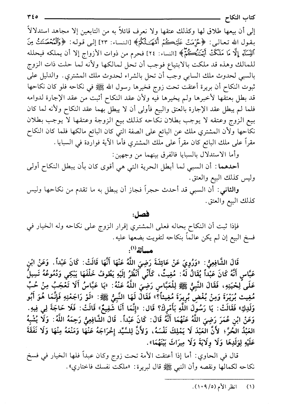 قَالَ الشَّافِعِيُّ: "وَرُوِيَ عَنْ عَائِشَةَ رَضِيَ اللهُ عَنْهَا أَنَّهَا قَالَتْ: كَانَ عَبْداً. وَعَنْ ابْنِ عَبَّاسٍ أَنَّهُ كَانَ عَبْداً يُقَالُ لَهُ: مُغِيثٌ، كَأَنِّي أَنْظُرُ إلَيْهِ يَطُوفُ خَلْفَهَا يَبْكِي وَدُمُوعُهُ تَسِيلُ عَلَى لِحْيَتِهِ، فَقَالَ النَّبِيُّ صلى الله عليه وسلم لِلْعَبَّاسِ رَضِيَ اللهُ عَنْهُ: "يَا عَبَّاسُ أَلَا تَعْجَبُ مِنْ حُبِّ مُغِيث بُرَيْرَةَ وَمِنْ بُغْضِ بُرِيرَةَ مُغِيثاً؟ " فَقَالَ لَهَا النَّبِيُّ صلى الله عليه وسلم: "لَوْ رَاجَعْتِهِ فَإِنَّمَا هُوَ أَبُو وَلَدِكِ" فَقَالَتْ: يَا رَسُولَ الله بَأَمْرِكَ؟ قَال: "إِنَّمَا أَنَا شَفِيعٌ" قَالَتْ: فَلَا حَاجَةَ لِي فِيهِ. وَعَنْ ابْنِ عُمَرَ رَضِيَ اللهُ عَنْهُمَا أَنَّهُ قَالَ: كَانَ عَبْداً. قَالَ الشَّافِعِيُّ رَحِمَهُ اللهُ: وَلَا يُشْبِهُ العَبْدُ الحُرَّ؛ لأَنَّ العَبْدَ لَا يَمْلِكَ نَفْسَهُ، وَلأَنَّ لِلسَّيِّد إِخْرَاجَهُ عَنْهَا وَمَنْعَهُ مِنْهَا وَلَا نَفَقَةَ عَلَيْهِ لِوَلَدِهَا وَلَا وِلَايَةَ وَلَا مِيرَاثَ بَيْنَهُمَا".