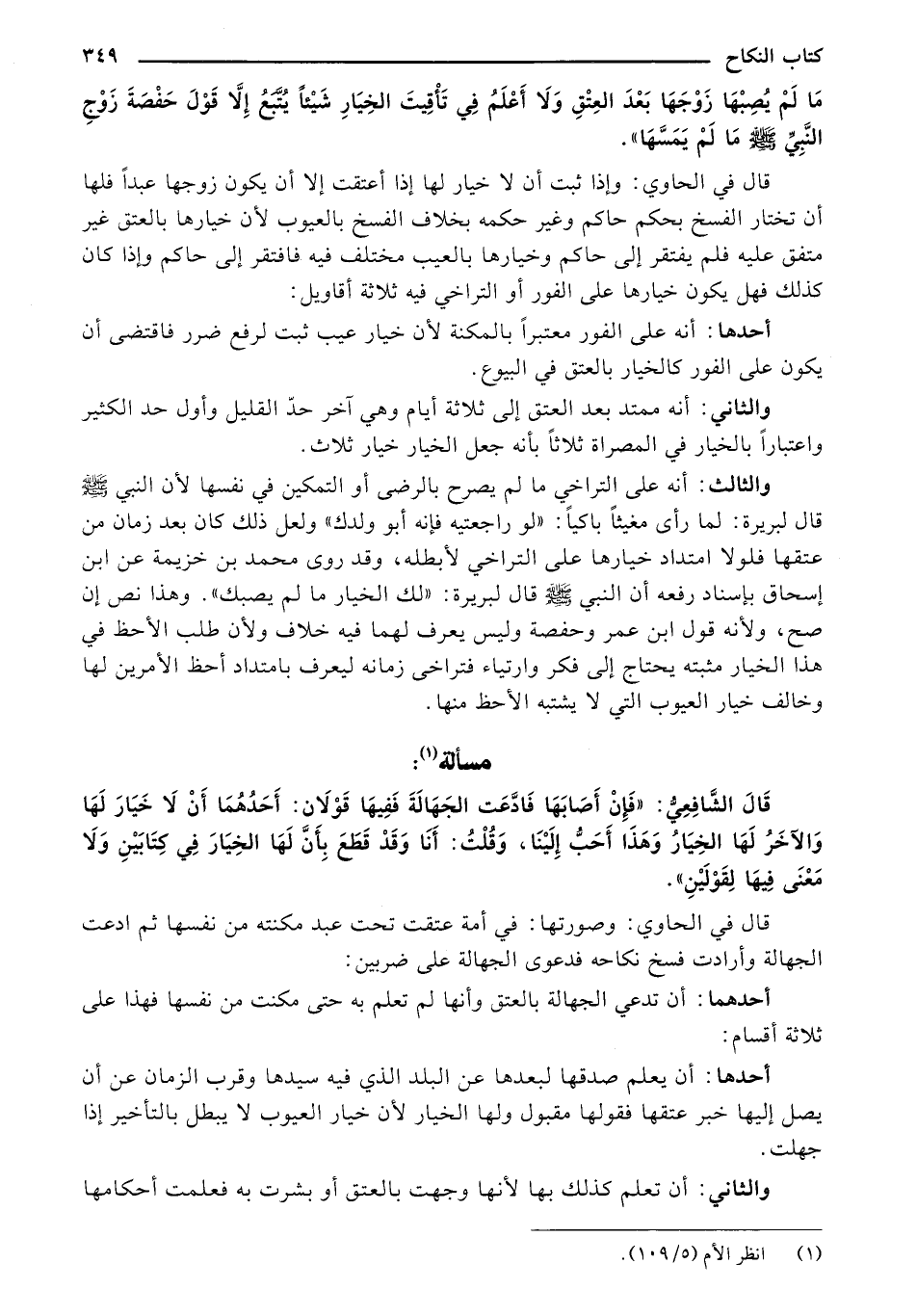 والثالث: أنه على التراخي ما لم يصرح بالرضي أو التمكين في نفسها لأن النبي صلى الله عليه وسلم قال لبريرة: لما رأى مغيثًا باكيًا "لو راجعتيه فإنه أبو ولدك" ولعل ذلك كان بعد زمان من عتقها فلولا امتداد خيارها على التراخي لأبطله، وقد روى محمد بن خزيمة عن ابن إسحاق بإسناد رفعه أ، النبي صلى الله عليه وسلم قال لبريرة: "لك الخيار ما لم يصبك". وهذا نص إن صح، ولأنه قول ابن عمر وحفصة وليس يعرف لهما فيه خلاف ولأن طلب الأحظ في هذا الخيار مثبته يحتاج إلى فكر وارتياء فتراخى زمانه ليعرف بامتداد أحظ الأمرين لها وخالف العيوب التي لا يشتبه منها.