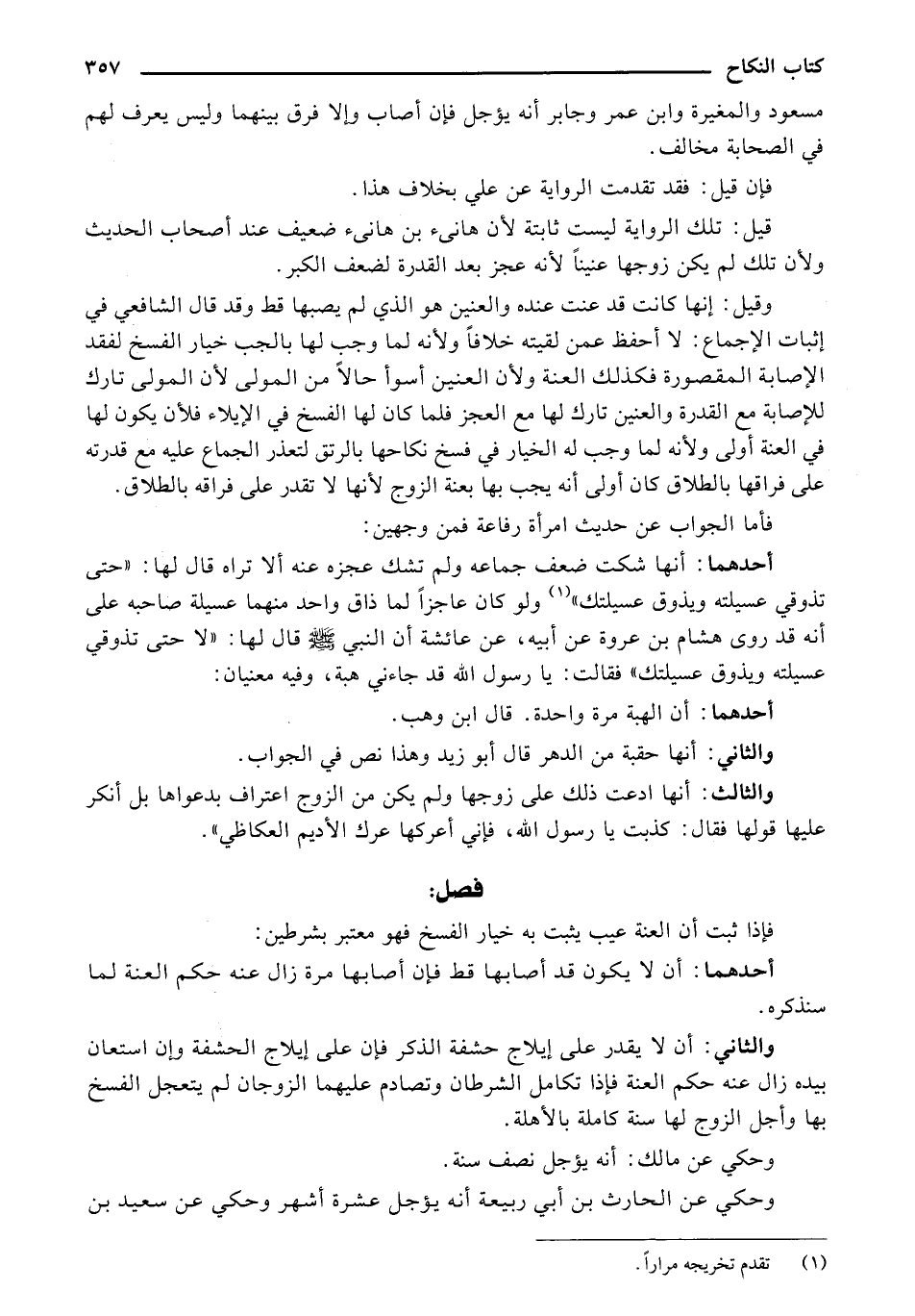فإذا ثبت أن العنة عيب يثبت به خيار الفسخ فهو معتبر بشرطين: