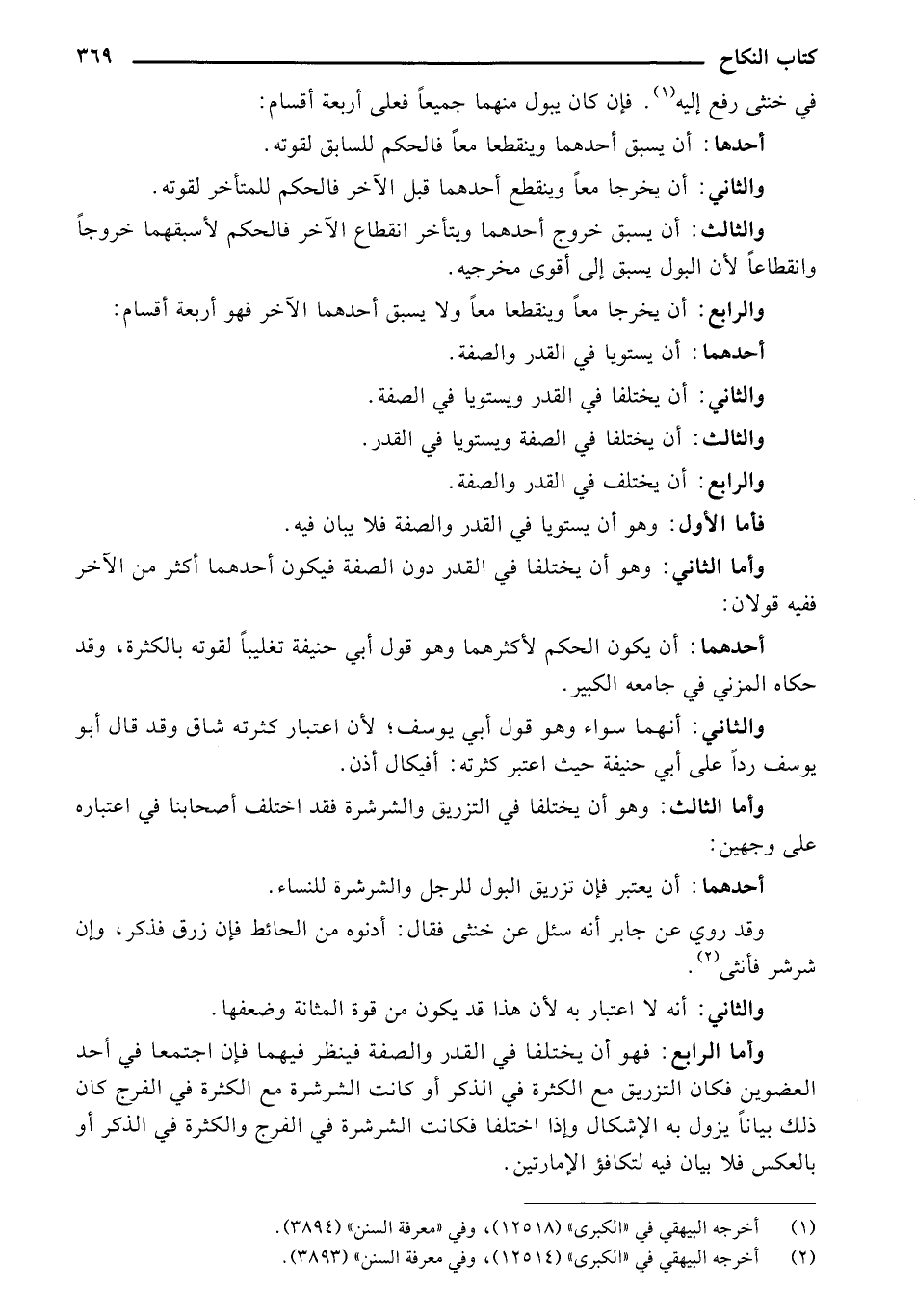 وأما الرابع: فهو أن يختلفا في القدر والصفة فينظر فيهما فإن اجتمعا في أحد العضوين فكان التزريق مع الكثرة في الذكر أو كانت الشرشرة مع الكثرة في الفرج كان ذلك بيانًا يزول به الإشكال وإذا اختلفا كانت الشرشرة في الفرج والكثرة في الذكر أو بالعكس فلا بيان فيه لتكافؤ الإمارتين.