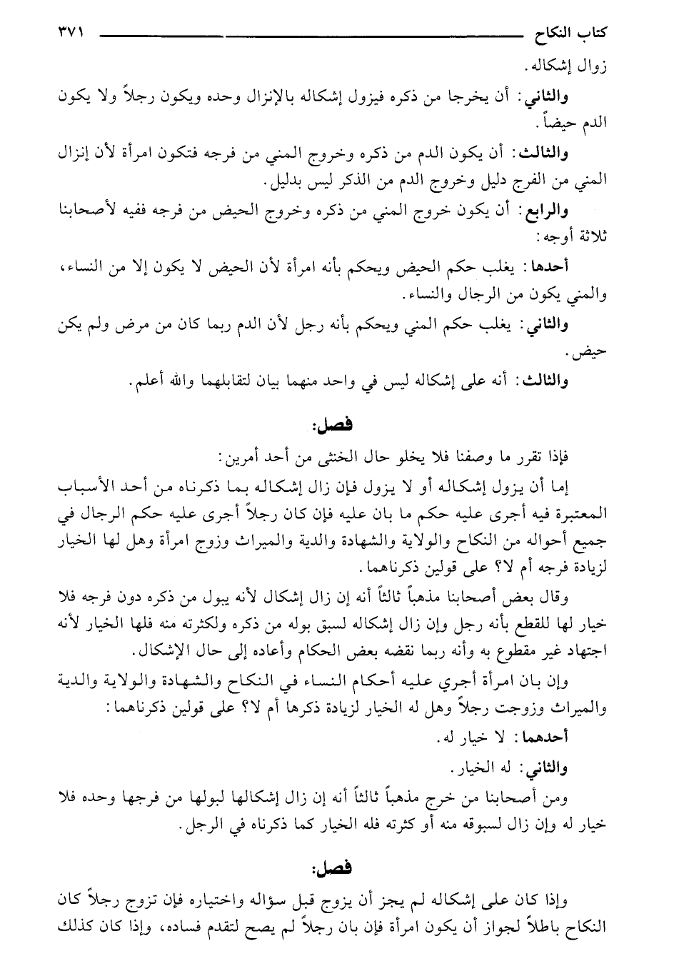 وقال بعض أصحابنا مذهبًا ثالثًا أنه إن زال إشكال لأنه يبول من ذكره دون فرجه فلا خيار لها للقطع بأنه رجل وإن زال إشكاله لسبق بوله من ذكره ولكثرته منه فلها الخيار لأنه اجتهاد غير مقطوع به وأنه ربما نقضه بعض الحكام وأعاده إلى حال الإشكال.