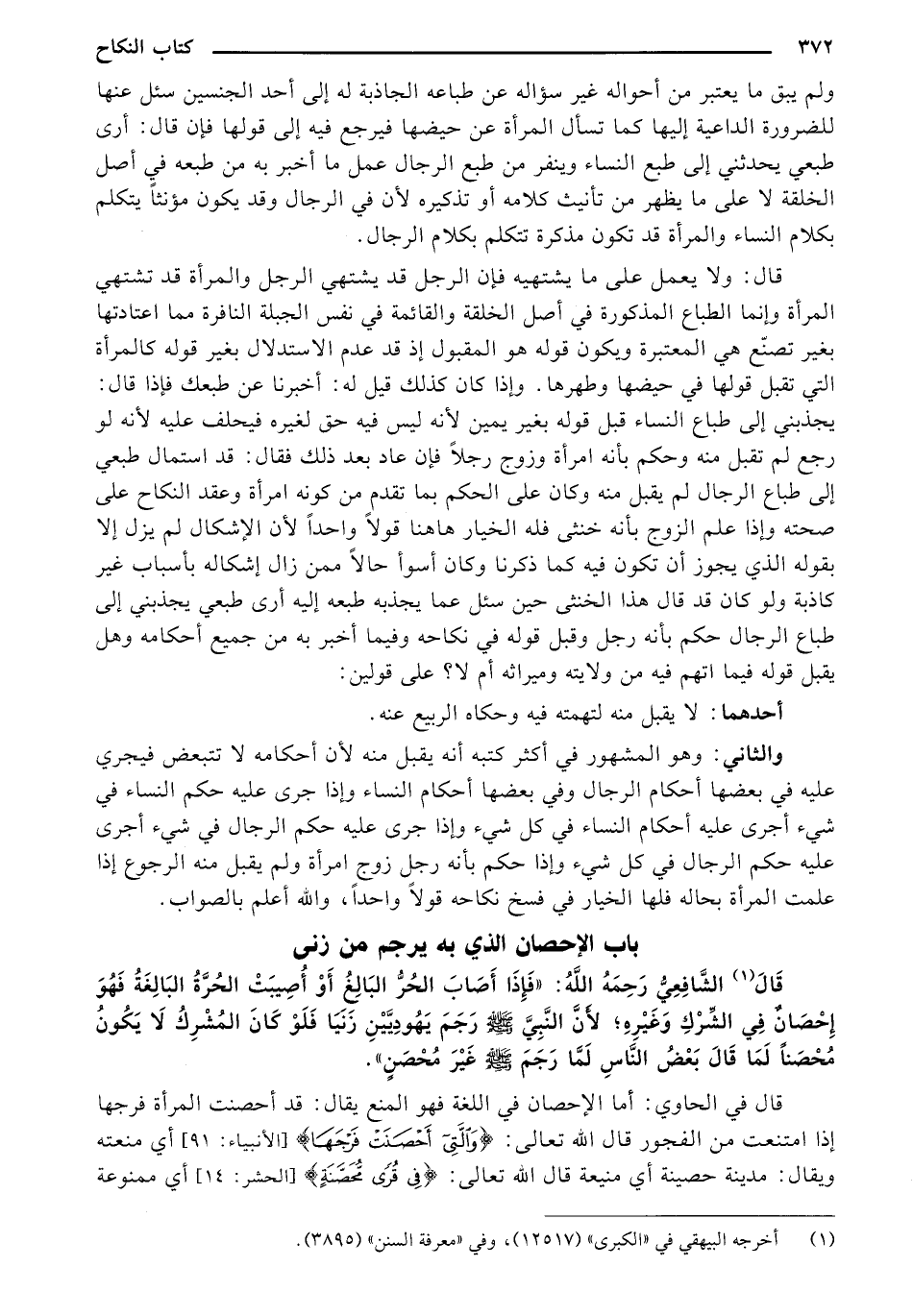 قَالَ الشَّافِعِيُّ رَحِمَهُ اللَّهُ: "فَإِذَا أَصَابَ الحُرُّ البَالِغُ أَوْ أُصِيبَتْ الحُرَّةُ البَالِغَةُ فَهُوَ إِحْصَانٌ فِي الشِّرْكِ وَغَيْرِهِ؛ لأَنَّ النَبِيَّ صَلَّى اللَّهُ عَلَيْهِ وَسَلَّمَ رَجَمَ يَهُودِيَّيْنِ زَنَيَا فَلَوْ كَانَ المُشْرِكُ لَا يَكُونُ مُحْصَنًا لمَا قَالَ بَعْضُ النَّاسِ لمَّا رَجَمَ صَلَّى اللَّهُ عَلَيْهِ وَسَلَّمَ غَيْرَ مُحْصَنٍ".
