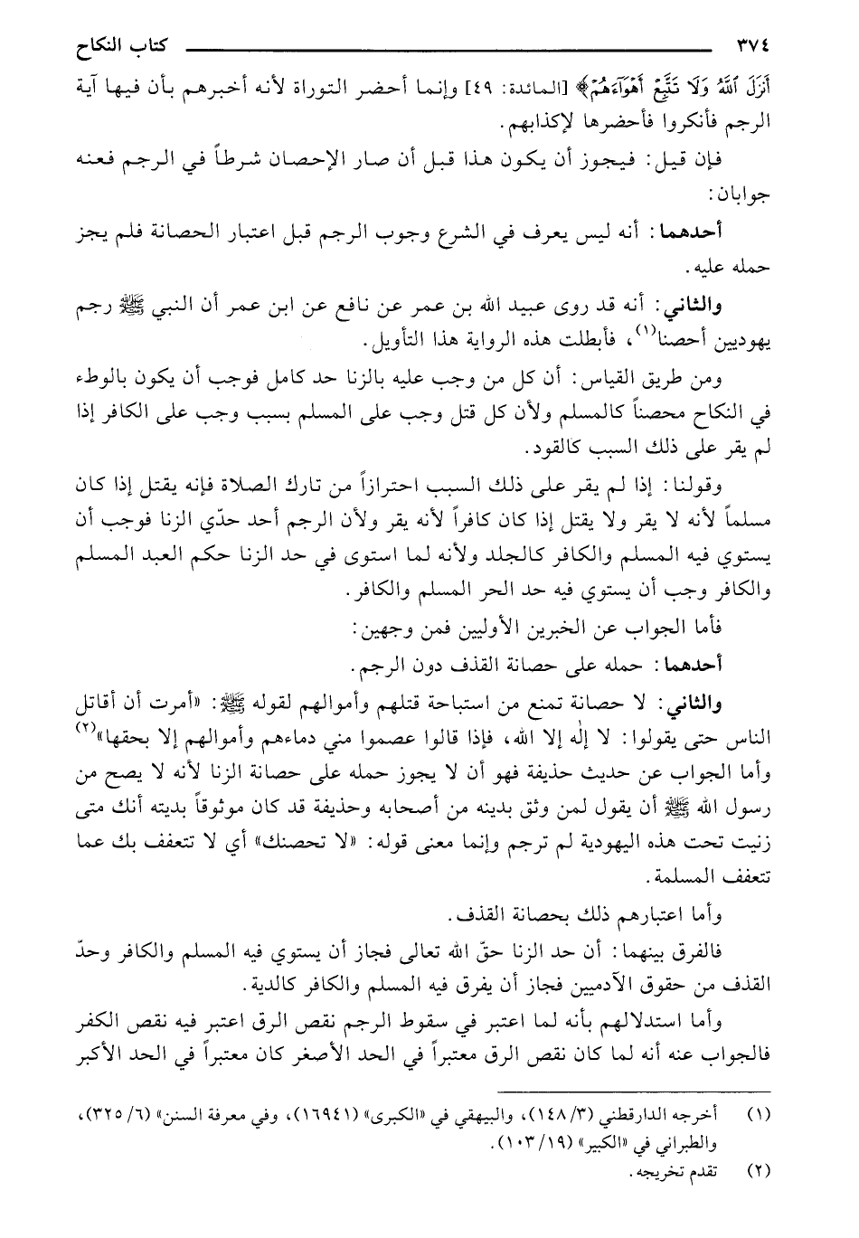 وأما استدلالهم بأنه لما اعتبر في سقوط الرجم نقص الرق اعتبر فيه نقص الكفر فالجواب عنه أنه لما كان نقص الرق معتبرًا في الحد الأصغر كان معتبرًا في الحد الأكبر