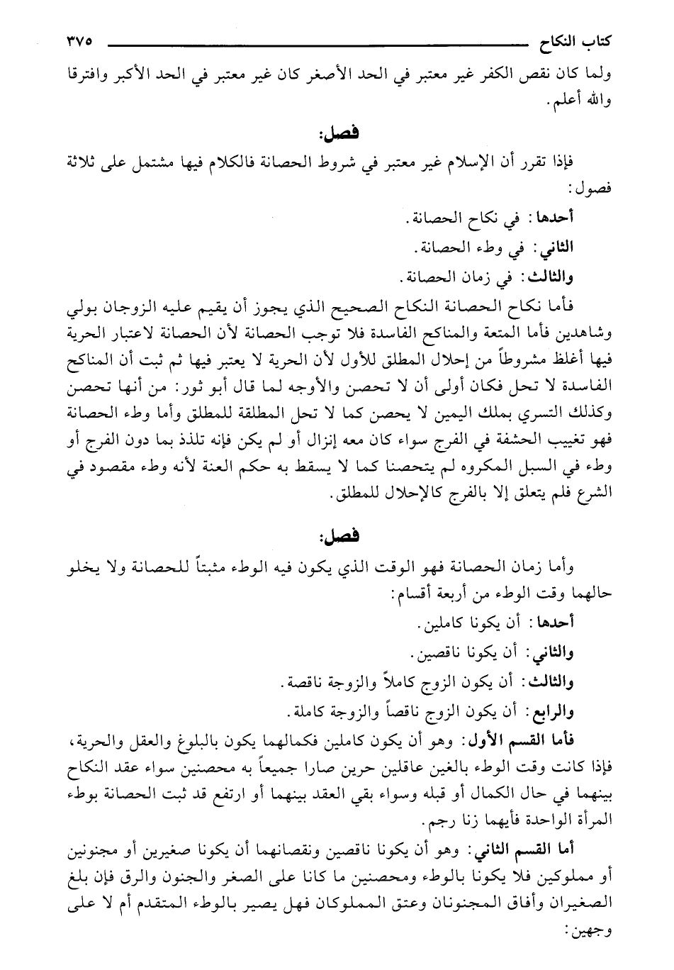 فإذا تقرر أن الإسلام غير معتبر في شروط الحصانة فالكلام فيها مشتمل على ثلاثة فصول: