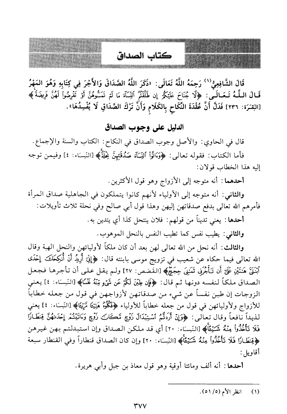 قَالَ الشَّافِعِيُّ رَحِمَهُ اللَّهُ تعالى: "ذَكَرَ اللَّهُ الصَّدَاقَ وَالأَجْرَ فِي كِتَابِهِ وَهُوَ المَهْرُ قَالَ اللَّهُ تَعَالَى: {لَا جُنَاحَ عَلَيْكُمْ إِنْ طَلَّقْتُمُ النِّسَاءَ مَا لَمْ تَمَسُّوهُنَّ أَوْ تَفْرِضُوا لَهُنَّ فَرِيضَةً} [البقرة: 236] فَدَلَّ أَنَّ عُقْدَةَ النِّكَاحِ بِالكَلَامِ وَأَنَّ تَرْكَ الصَّدَاقِ لَا يُفْسِدُهَا".