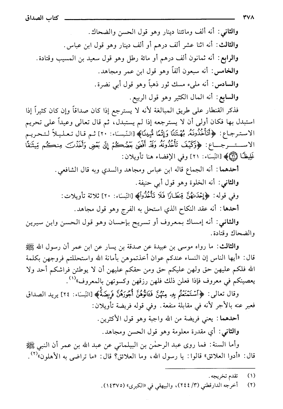 فذكر القنطار على طريق المبالغة لأنه لا يسترجع إذا كان صداقًا وإن كان كثيرًا إذ استبدل بها فكان أولى أن لا يسترجعه إذا لم يستبدل, ثم قال تعالى وعيدًا على تحريم الاسترجاع: {أَتَاخُذُونَهُ بُهْتَانًا وَإِثْمًا مُبِينًا} [النساء:20] ثم قال تعليلًا لتحريم الاسترجاع: {وَكَيْفَ تَاخُذُونَهُ وَقَدْ أَفْضَى بَعْضُكُمْ إِلَى بَعْضٍ وَأَخَذْنَ مِنْكُمْ مِيثَاقًا غَلِيظًا} [النساء: 21] وفي الإفضاء هنا تأويلان: