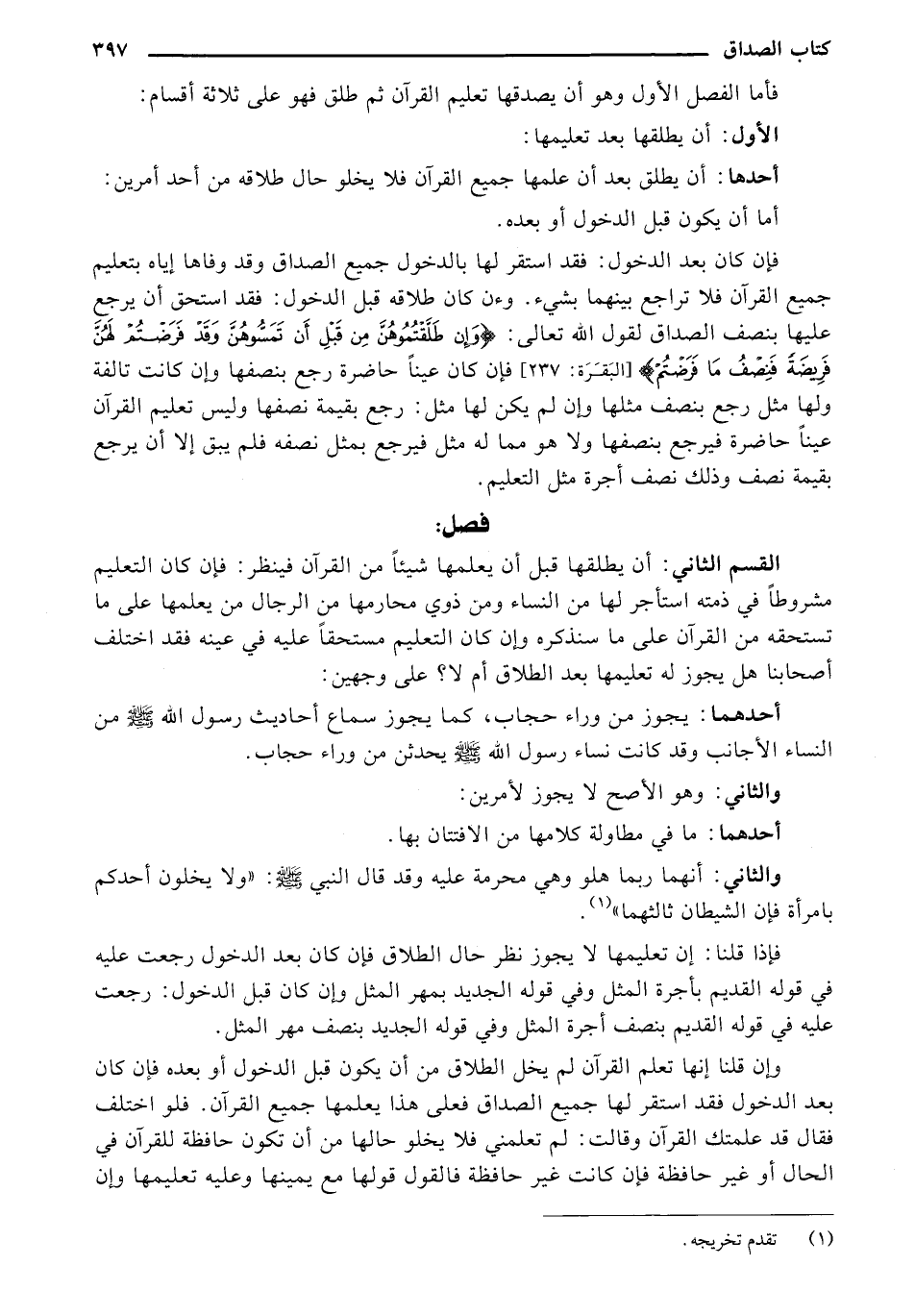 فأما الفصل الأول وهو أن يصدقها تعليم القرآن ثم طلق فهو على ثلاثة أقسام: