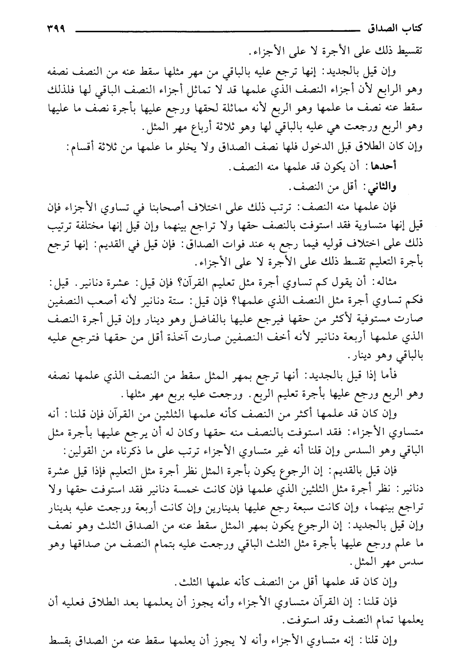 مثاله: أن يقول كم تساوي أجرة مثل تعليم القرآن؟ فإن قيل: عشرة دنانير. قيل: فكم تساوي أجرة مثل النصف الذي علمها؟ فإن قيل: ستة دنانير لأنه أصعب النصفين صارت مستوفية لأكثر من حقها فيرجع عليها بالفاضل وهو دينار وإن قيل أجرة النصف الذي علمها أربعة دنانير لأنه أخف النصفين صارت آخذة أقل من حقها فترجع عليه بالباقي وهو دينار.