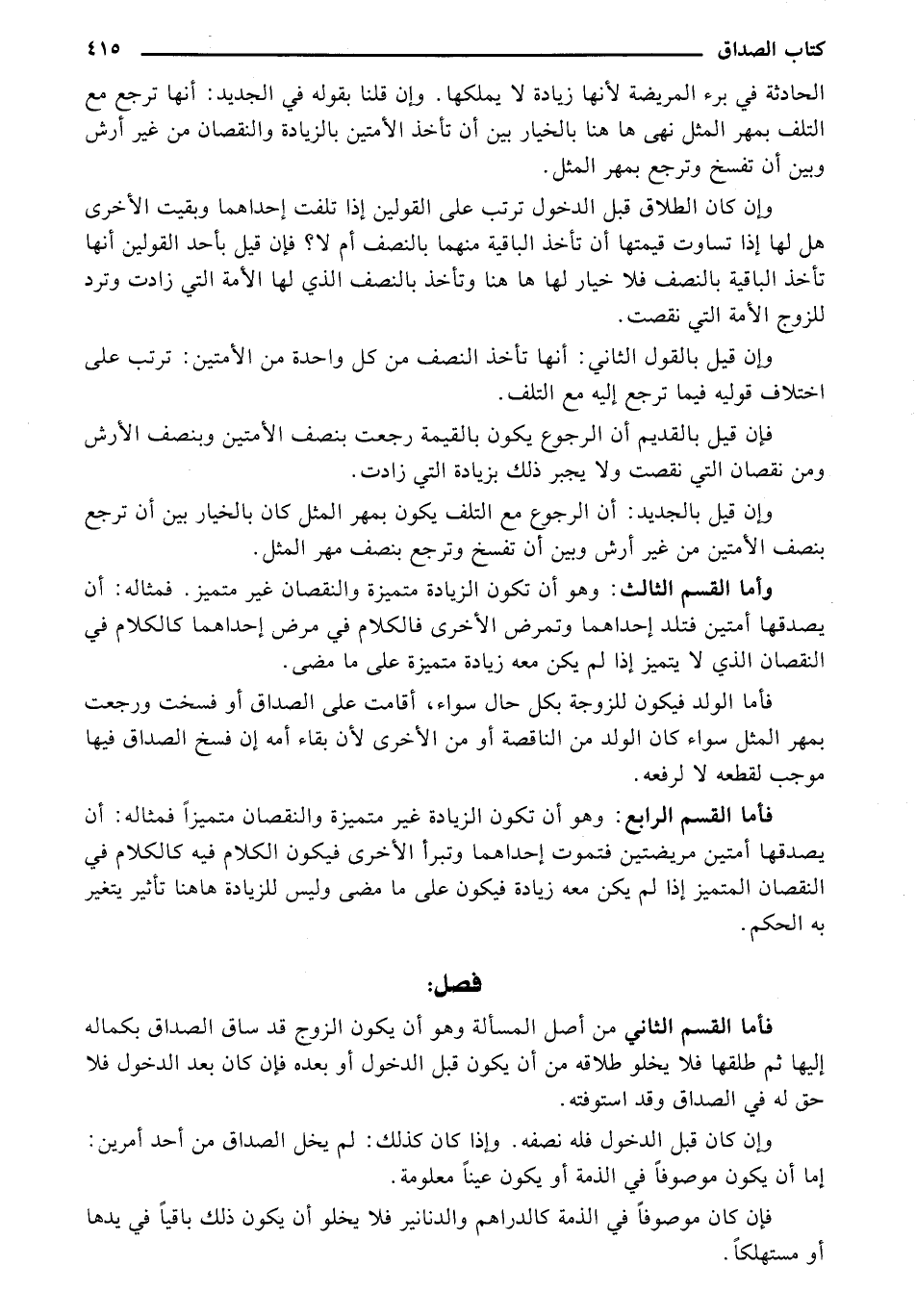 فأما القسم الرابع: وهو أن تكون الزيادةَ غير متميزةً والنقصان متميزا فمثاله: أن يصدقها أمتين مريضتين فتموت إحداهما وتبرأ الأخرى فيكون الكلام فيه كالكلام في النقصان المتميز إذا لم يكن معه زيادةً فيكون على ما مضى وليس للزيادةً هاهنا تأثير يتغير به الحكم.