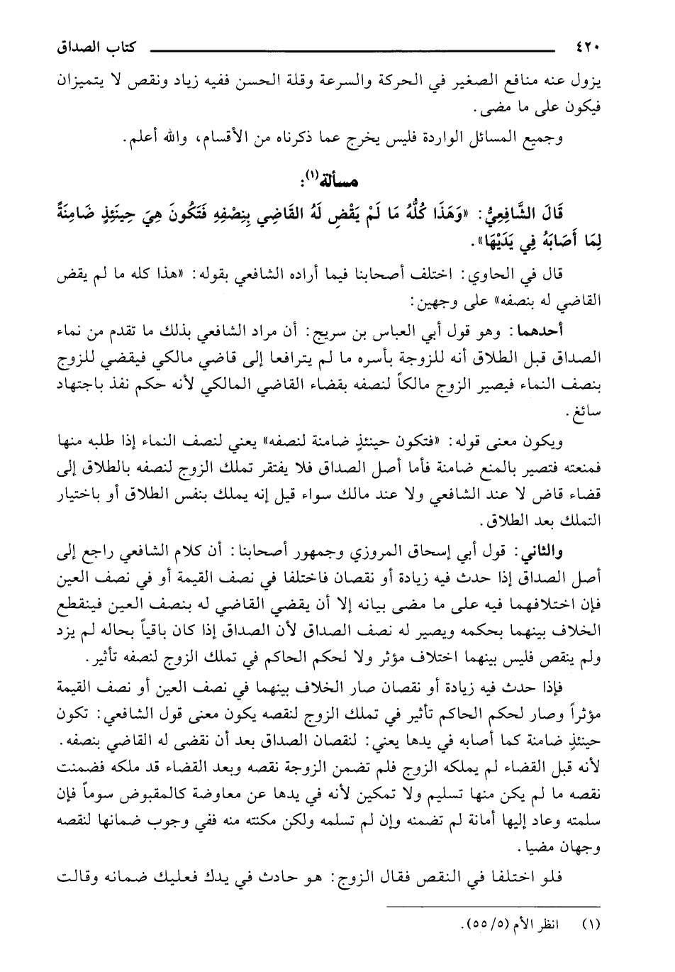 فإذا حدث فيه زيادةً أو نقصان صار الخلاف بينهما في نصف العين آو نصف القيمة مؤثرًا وصار لحكم الحاكم تأثير في تملك الزوج لنقصه يكون معنى قول الشافعي: تكون حينئذ ضامنة كما أصابه في يدها يعنى: لنقصان الصداق بعد أن نقضى له القاضي بنصفه. لأنه قبل القضاء لم يملكه الزوج فلم تضمن الزوجةً نقصه وبعد القضاء قد ملكه ضمنت نقصه ما لم يكن منها تسليم ولا تمكين لأنه في يدها عن معاوضةً كالمقبوض سومًا فإن سلمته وعاد إليها أمانةً لم تضمنه وإن لم تسلمه ولكن مكنته منه ففي وجوب ضمانها لنقصه وجهان مضيا.