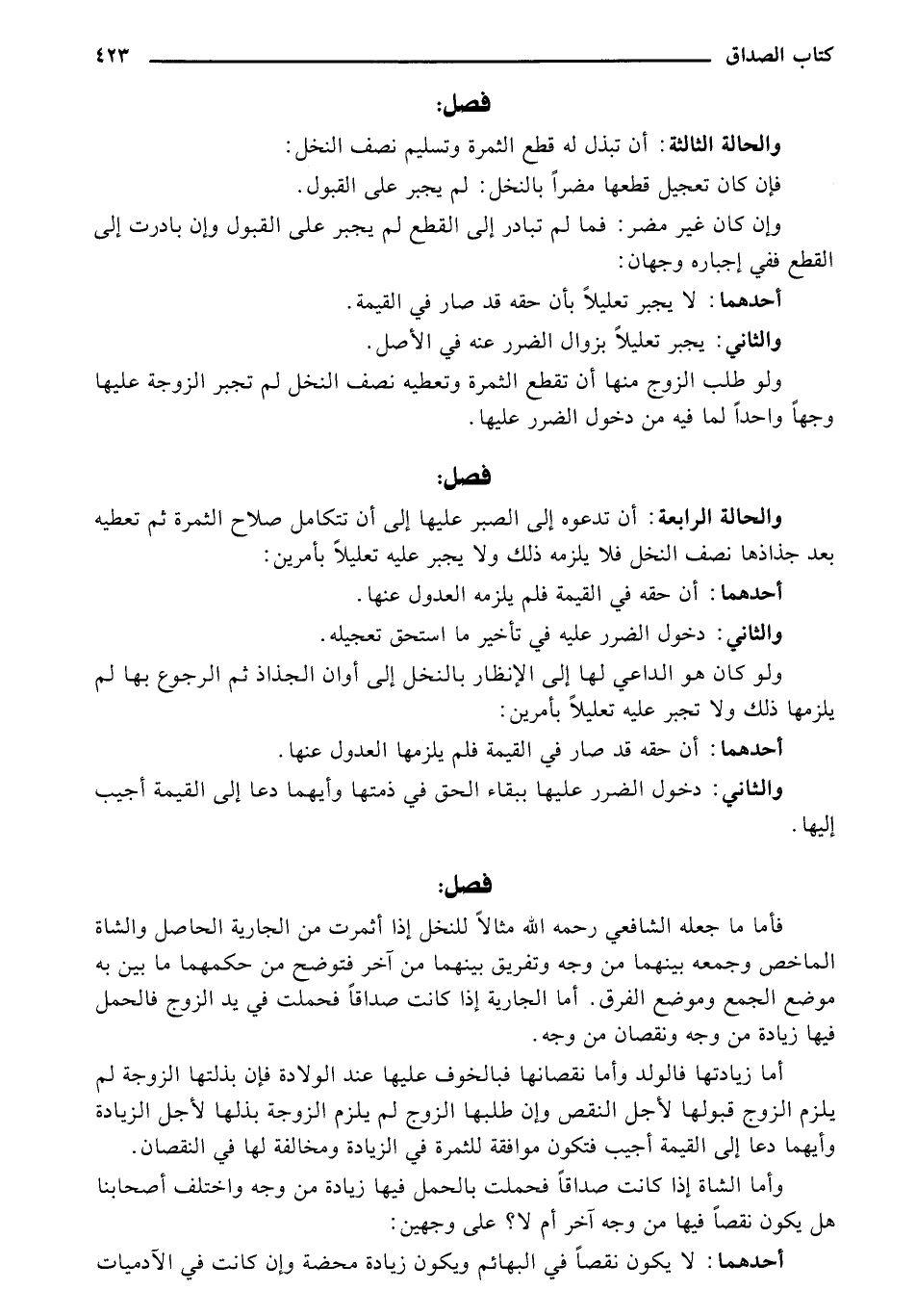 ولو طلب الزوج منها أن تقطع الثمرة وتعطيه نصف النخل لم تجبر الزوجة عليها وجهًا واحدًا لما فيه من دخول الضرر عليها.