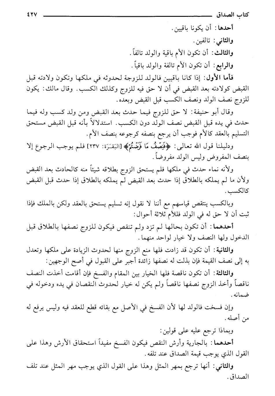 وقال أبو حنيفة: لا حق للزوج فيما حدث بعد القبض ومن ولد وله فيما حدث في يده قبل القبض نصف الولد دون الكسب. استدلالاً بأنه قبل القبض مستحق التسليم بالعقد كالأم فوجب أن يرجع بنصفه كرجوعه بنصف الأم.