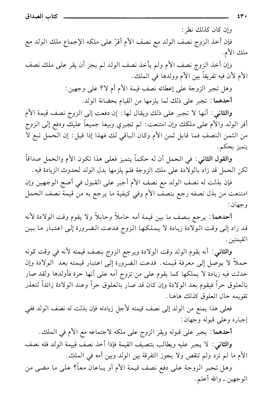 وهل تجبر الزوجة على إعطائه نصف قيمة الأم أم لا؟ على وجهين: