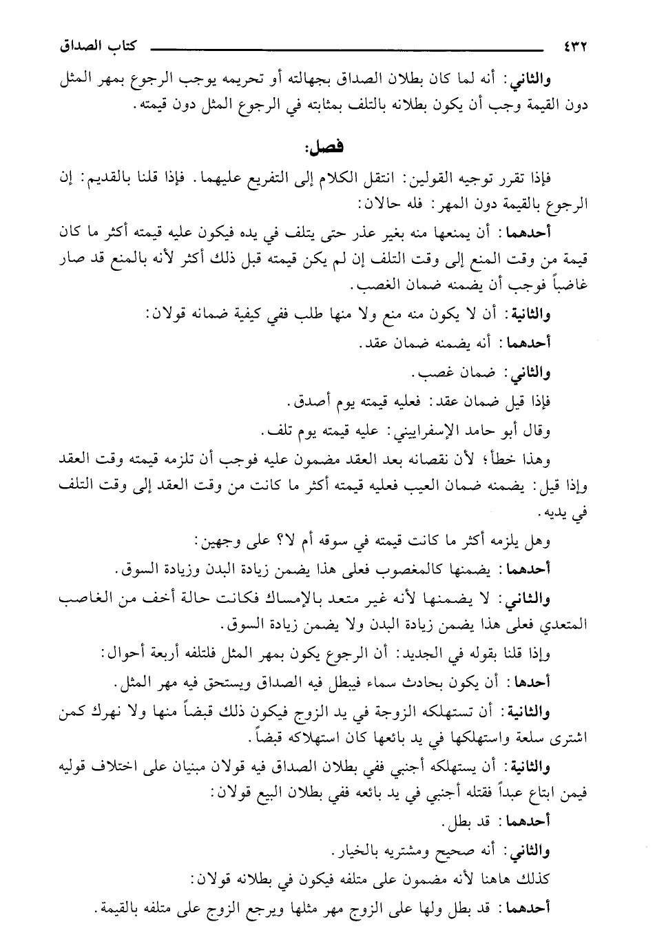 والثاني: أنه لما كان بطلان الصداق بجهالته أو تحريمه يوجب الرجوع بمهر المثل دون القيمة وجب أن يكون بطلانه بالتلف بمثابته في الرجوع المثل دون قيمته.