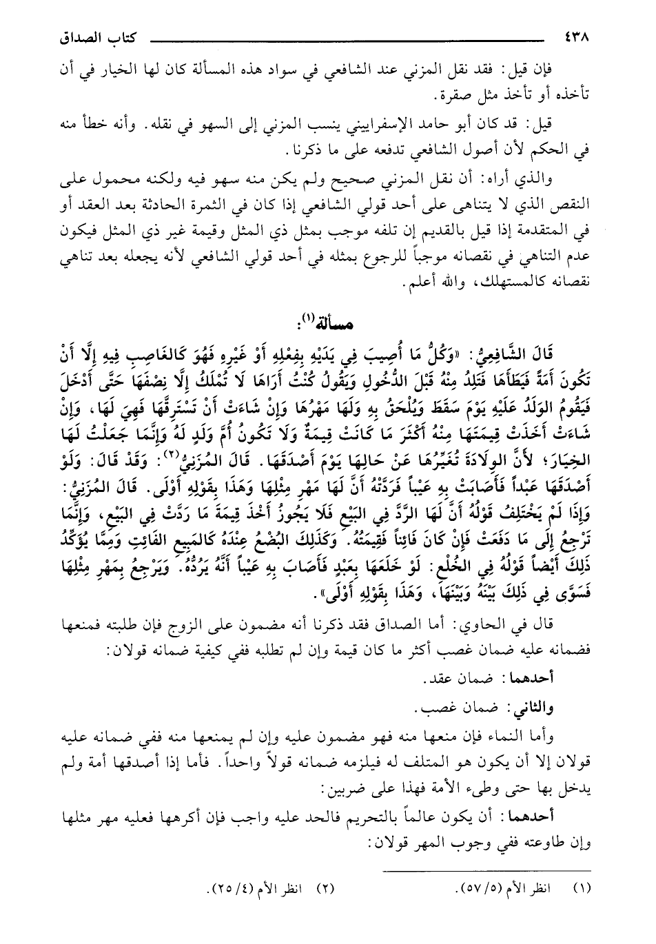 قَالَ الشَّافِعِيُّ: "وَكُلُّ مَا أُصِيبَ فِي يَدَيْهِ بِفِعْلِهِ أَوْ غَيْرِه فَهّوَ كَالغَاصِبِ فِيهِ إِلاَّ أَنْ تَكُونَ أَمَةً فَيَطَأَهَا فَتَلدُ مِنْهُ قَبْلَ الدُّخَولِ وَيَقُولُ كُنْتُ أَرَاهَا لاَ تُمْلَكُ إلاَّ نِصْفَهَا حِتَّى أَدْخَلَ فَيَقُومُ الوَلَدُ عَلَيْهِ يَوْمَ سَقَطَ وَيُلُحَقُ بِهِ وَلَهَا مَهْرُهَا وَإِنْ شَاءَتْ أَنْ تَسْتَرقَّهَا فَهِيَ لَهَا، وَإِنْ شَاءَتْ أَخَذَتْ قِمَتَهَا مِنْهُ أَكْثَرَ مَا كَانَتْ قِيمَةٌ وَلاَ تَكُونُ أُمَّ وَلَدٍ لَهُ وَإِنَّمَا جَعَلْتُ لَهَا الخِيَارَ؛ لأَنَّ الوِلاَدَةَ تُغَيِّرُهَا عَنْ حَالِهَا يَوْمَ أَصْدَقَهَا. قَالَ المُزَنِيٌّ: وَقَدْ قَالَ: وَلَوْ أَصْدَقَهَا عَبْدًا فَأَصَابَتْ بهِ عَيْبًا فَرَدَّتْهُ أَنَّ لَهَا مَهْرِ مِثْلِهَا وَهَذَا بِقَوْلِهِ أَوْلَى. قَالَ المُزَنِيُّ: وَإِذّا لَمْ يَخْتَلِفُ أَنَّ لَهَا الرَّدَّ في البَيْعِ فَلاَ يَجُوزُ أَخْذَ قِيمَةَ مَا رَدَّتُ فِي البّيْعِ، وَإِنَّمَا تَرْجِعُ إِلَى مَا دَفَعَتْ فَإِنْ كَانَ فَائِنًا فَقيمَتُهُ. وَكَذَلِكَ البُضْعُ عِنْدَهُ كَالمَبِيعِ الفَائِتِ وَمَمَّا يُؤَكِّدُ ذَلِكَ أَيْضًا قَوْلُهُ فِي الخُلْع: لَوْ خَلَعَهَا بِعَبْدٍ فَأَصَابَ بِهِ عَيْبًا أَنَّهُ يَرُدُّهُ. وَيَرْجِعُ بِمَهْرِ مِثْلِهَا فَسًوَّى في َّلِكَ بَيْنُهُ وَبَيْنَهَا، وَهَذَا بِقَوْلِهِ أَوْلَى ".