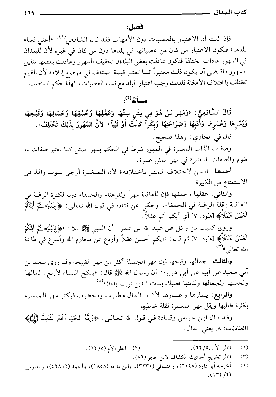 والثالث: جمالها وقبحها فإن مهر الجميلة أكثر من مهر القبيحة وقد روى سعيد بن أبي سعيد عن أبيه عن أبي هريرة: أن رسول الله صلى الله عليه وسلم قال: "ينكح النساء لأربع: لمالها ولحسبها ولجمالها ولدينها فعليك بذات الدين تربت يداك".