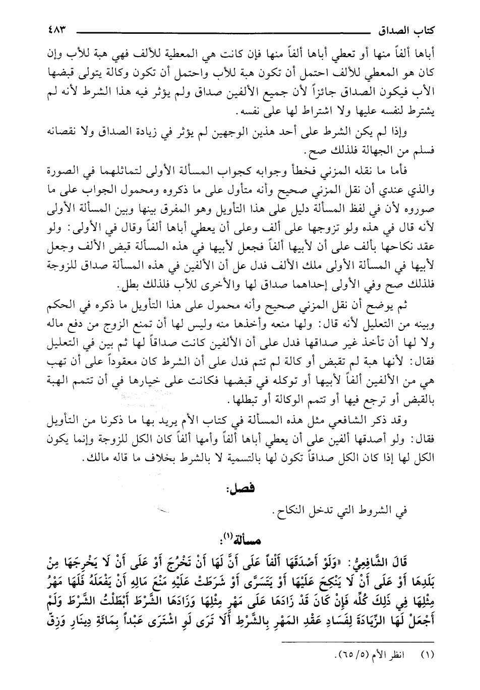 قال الشافعي: "ولو أصدقها ألفًا على أن لها أن تخرج أو على أن لا يخرجها من بلدا أو على أن لا ينكح عليها أو يتسرى أو شرطت عليه منع ماله أن يفعله فلها مهر مثلها في ذلك كله فإن كان قد زادها على مهر مثلها وزادها الشرط أبطلت الشرط ولم أجعل لها الزيادة لفساد عقد المهر بالشرط ألا ترى لو اشترى عبدًا بمائة دينار (ورق)