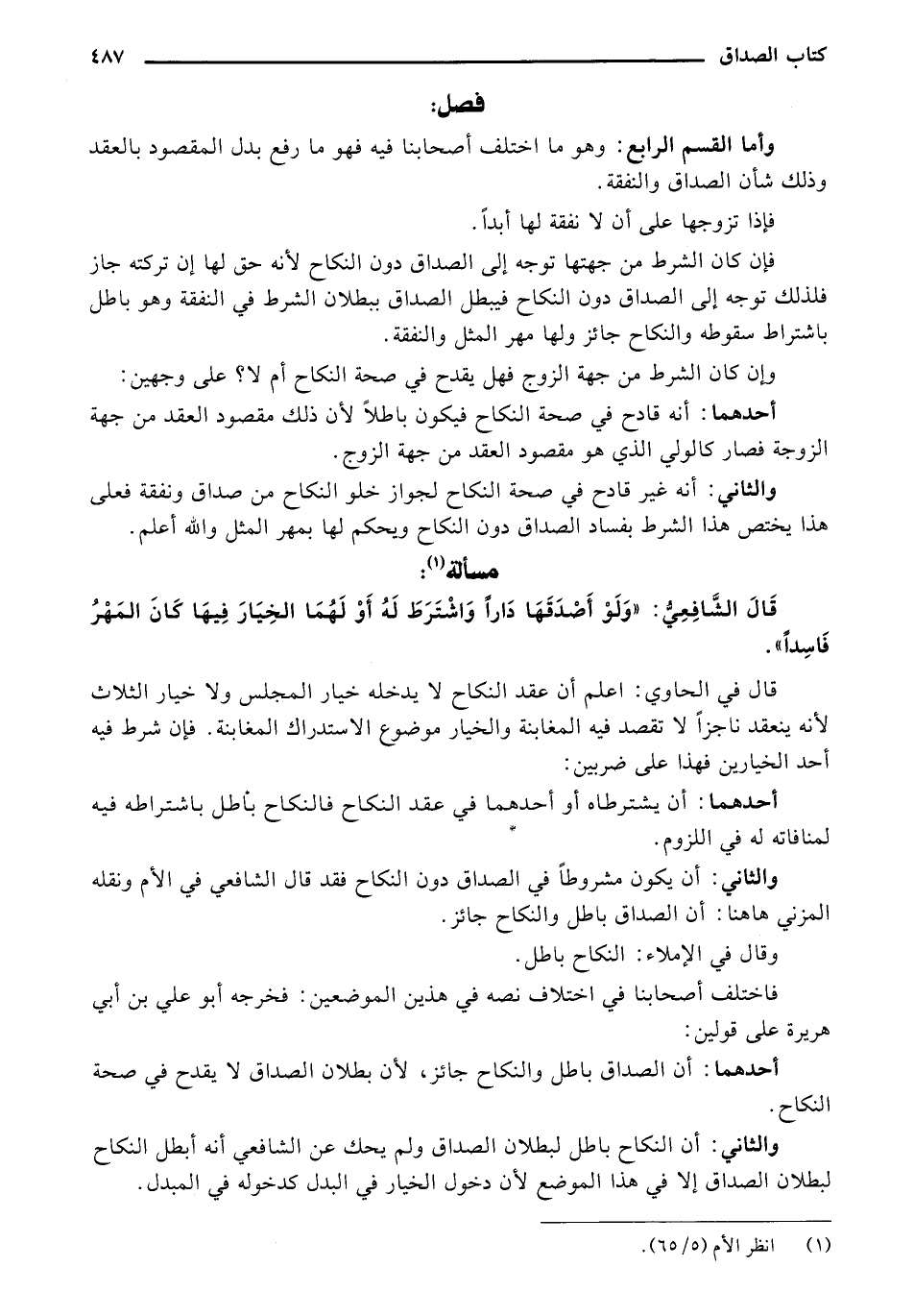 والثاني: أنه غير قادح في صحة النكاح لجواز خلو النكاح من صداق ونفقة فعلى هذا يختص هذا للشرط بفساد الصداق دون النكاح ويحكم لها بمهر المثل والله أعلم.