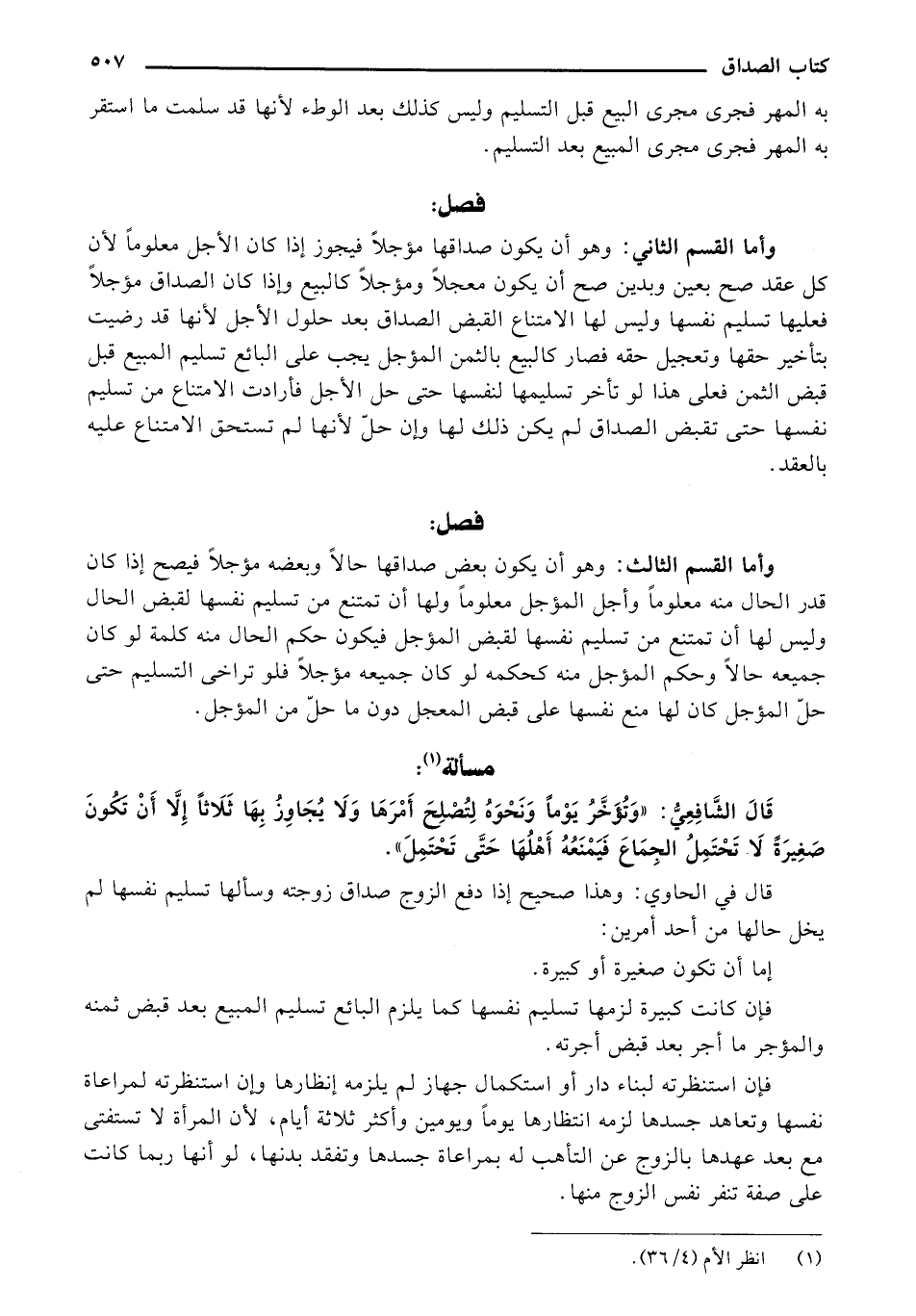 وأما القسم الثاني: وهو أن يكون صداقها مؤجلاً فيجوز إذا كان الأجل معلومًا لأن كل عقد صح بعين وبدين صح أن] كون معجلاً أو مؤجلاً كالبيع وإذا كان الصداق مؤجلاً فعليها تسليم نفسها وليس لها الامتناع القبض الصداق بعد حلول الأجل لأنها قد رضيت بتأخير حقها وتعجيل حقه فصار كالبيع بالثمن المؤجل يجب على البائع تسليم المبيع قبل قبض الثمن فعلى هذا لو تأخر تسليمها لنفسها حتى حل الأجل فأرادت الامتناع من تسليم نفسها حتى تقبض الصداق لم يكن لها وإن حلّ لأنها لم تستحق الامتناع عليه بالعقد.